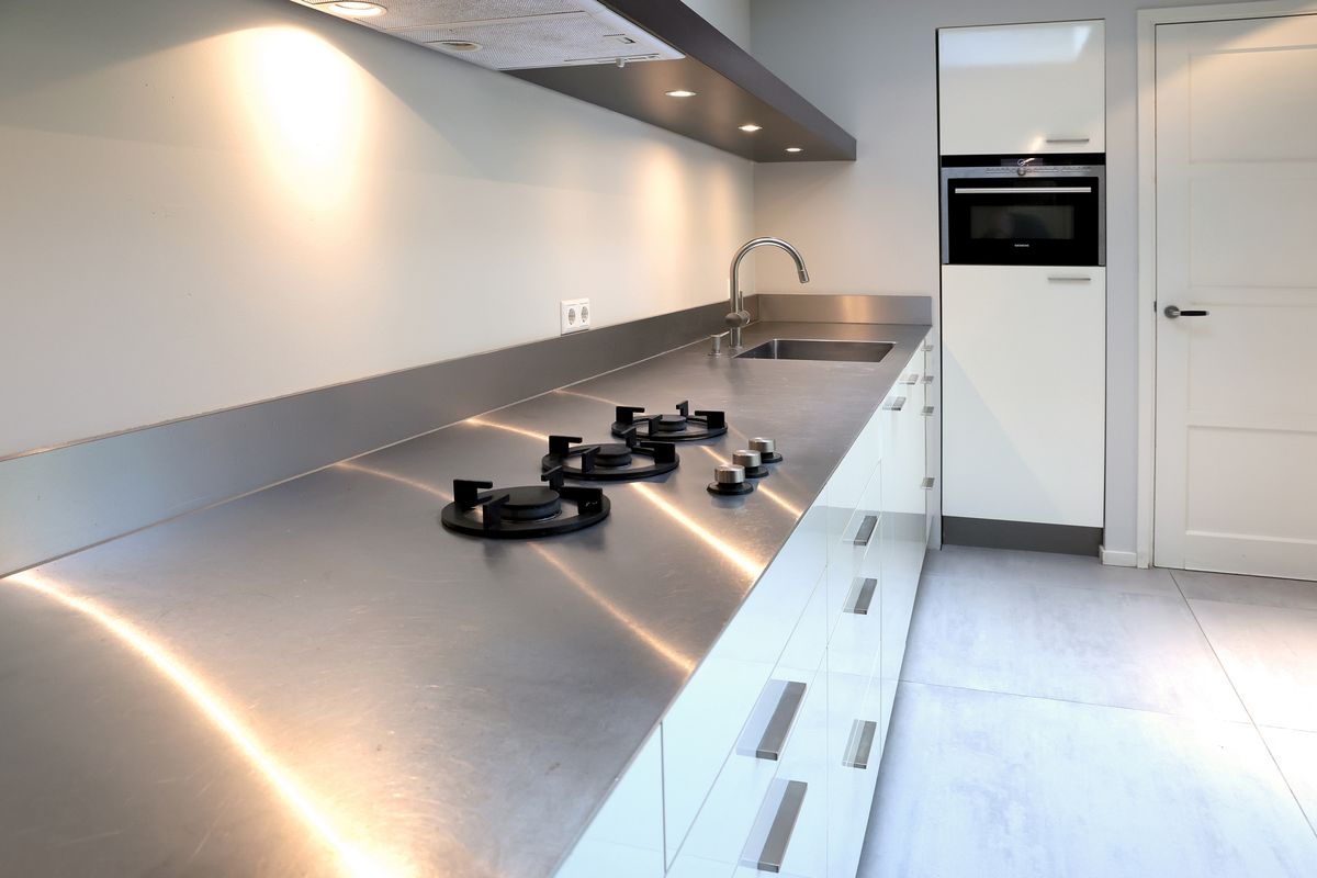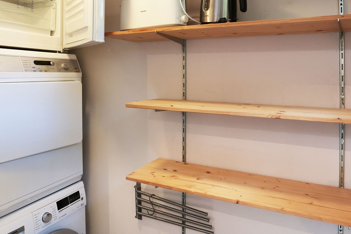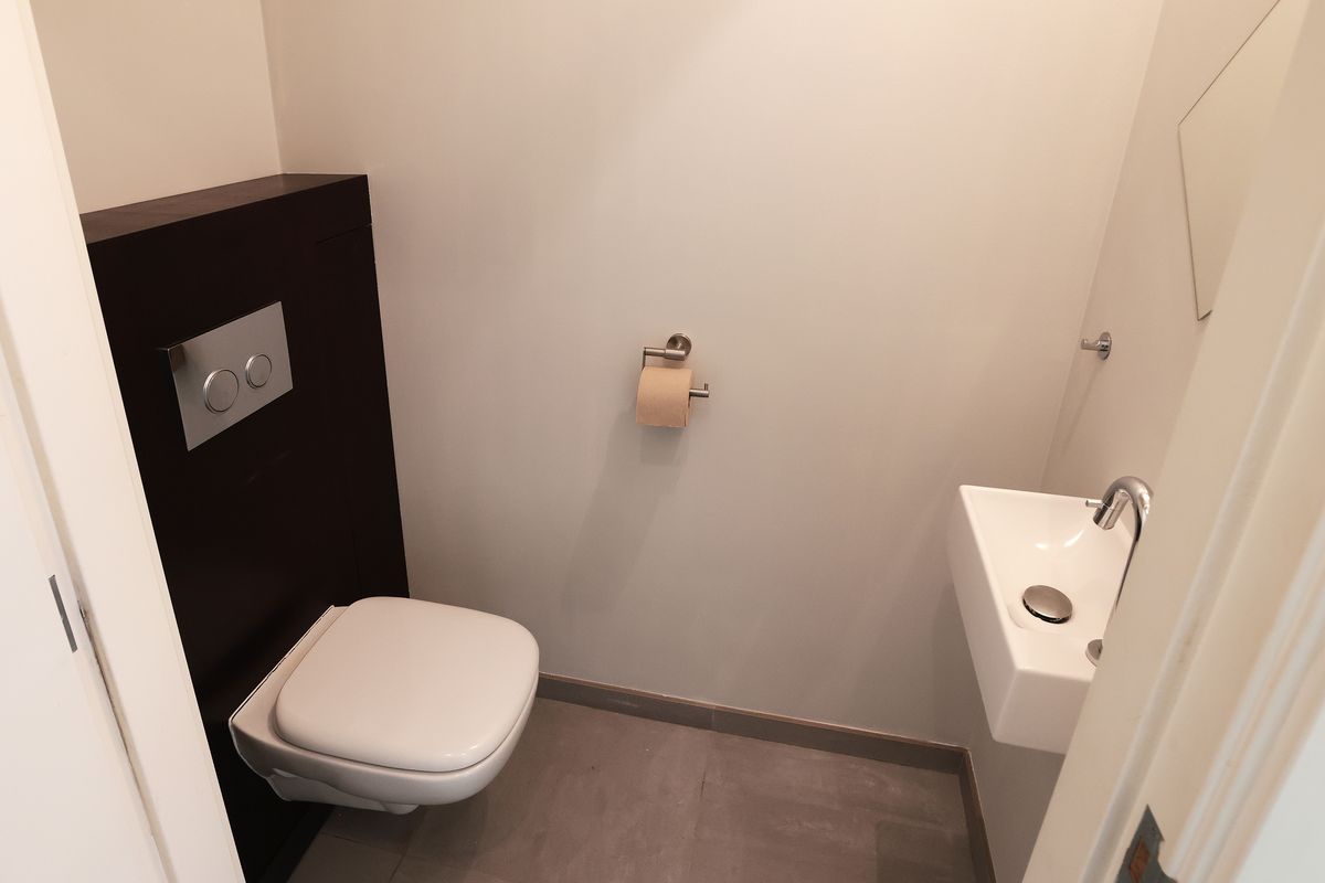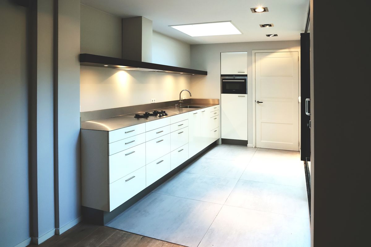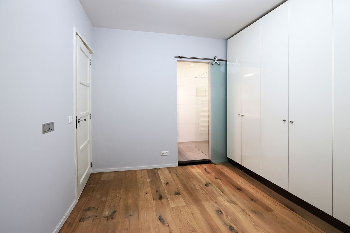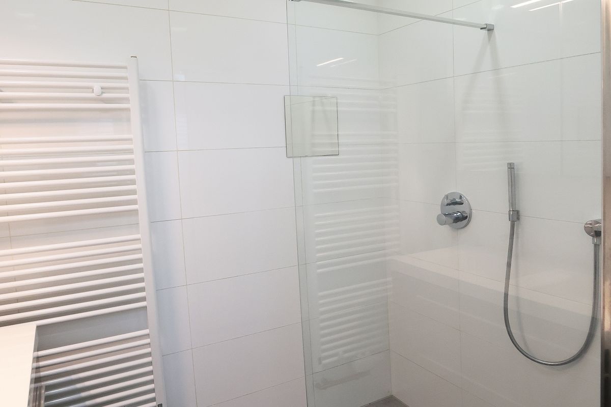 Spacious hallway; on the right-hand side access to the bedroom, passage to the bathroom with double washbasin and generous shower. At the end of the hallway is the spacious living and dining room. At the rear is the very large kitchen, fully equipped with all conveniences, featuring sliding doors to the garden. Behind the kitchen is a storage room with washing machine, dryer, and freezer.
