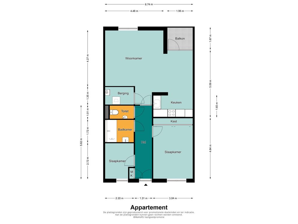 Je komt binnen in de hal met meterkast, vanwaar je toegang hebt tot de verschillende vertrekken. Het appartement beschikt over twee slaapkamers, beiden gelegen aan de achterzijde: