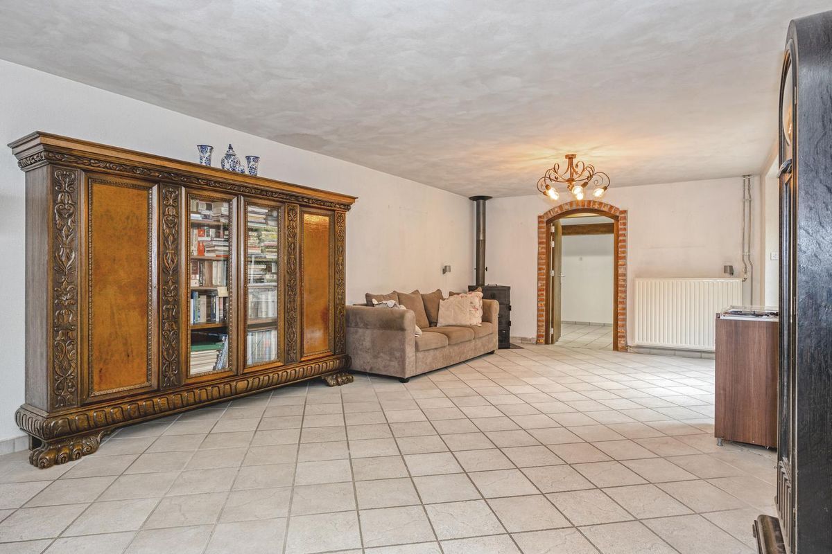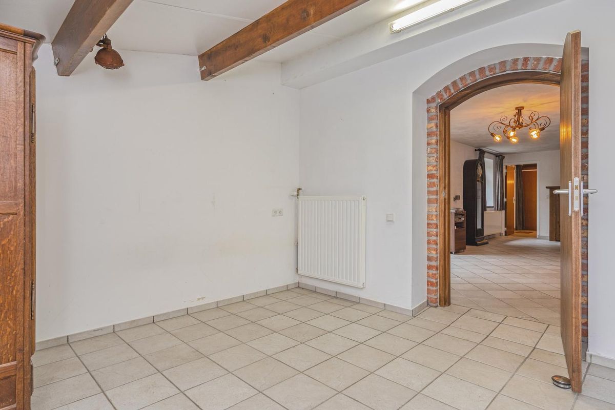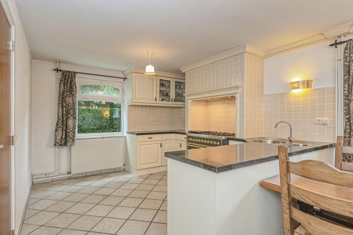 Naast de keuken is de bijkeuken, met een tweede keukenblok en een eigen entree. Het samenvoegen van de keuken en bijkeuken resulteert in een grote woonkeuken, met aan drie kanten lichtinval en uitzicht naar het groen. Een portaal verbindt de bijkeuken met een inpandige berging en de garage. Zowel de berging als garage kunnen worden verbouwd tot kantoor/werkruimte of voor het verplaatsen van de woonkamer naar de achterzijde. Fraai element is de oude buitengevel van het oorspronkelijke woonhuis, zichtbaar in de garage.