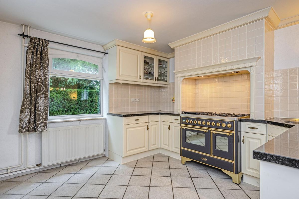 De eetkeuken is een gezellige plek in huis, waar de zon ’s middags en ’s avonds naar binnen valt. Er is genoeg plek voor een eettafel en de royale hoekopstelling is uitgevoerd in een landelijke stijl. Blikvanger is het Boretti Majestic 5 pits-gasfornuis met twee ovens en verder zijn er een koelkast, afzuiging en een vaatwasser ingebouwd.