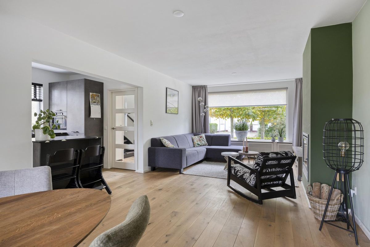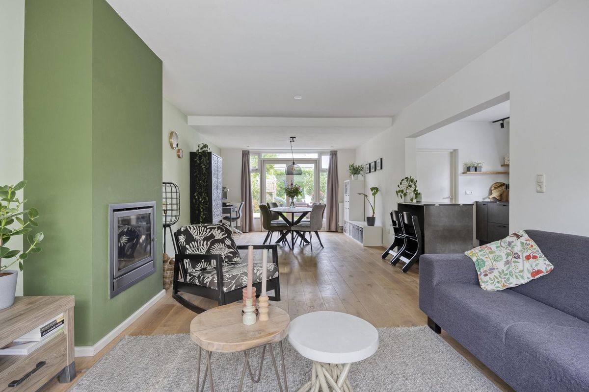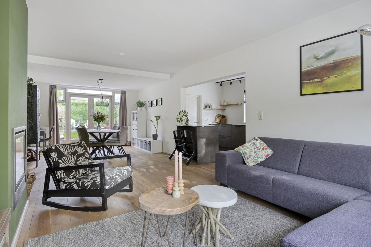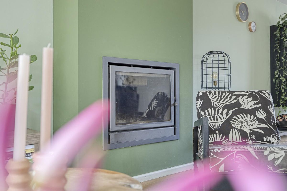 De sfeervolle en ruime woonkamer van circa 36 m² is afgewerkt met een massief houten vloer. De houthaard zorgt voor extra warmte en gezelligheid, waardoor het een fijne plek is om ’s avonds te zitten. Via de openslaande tuindeuren stap je direct de achtertuin in.