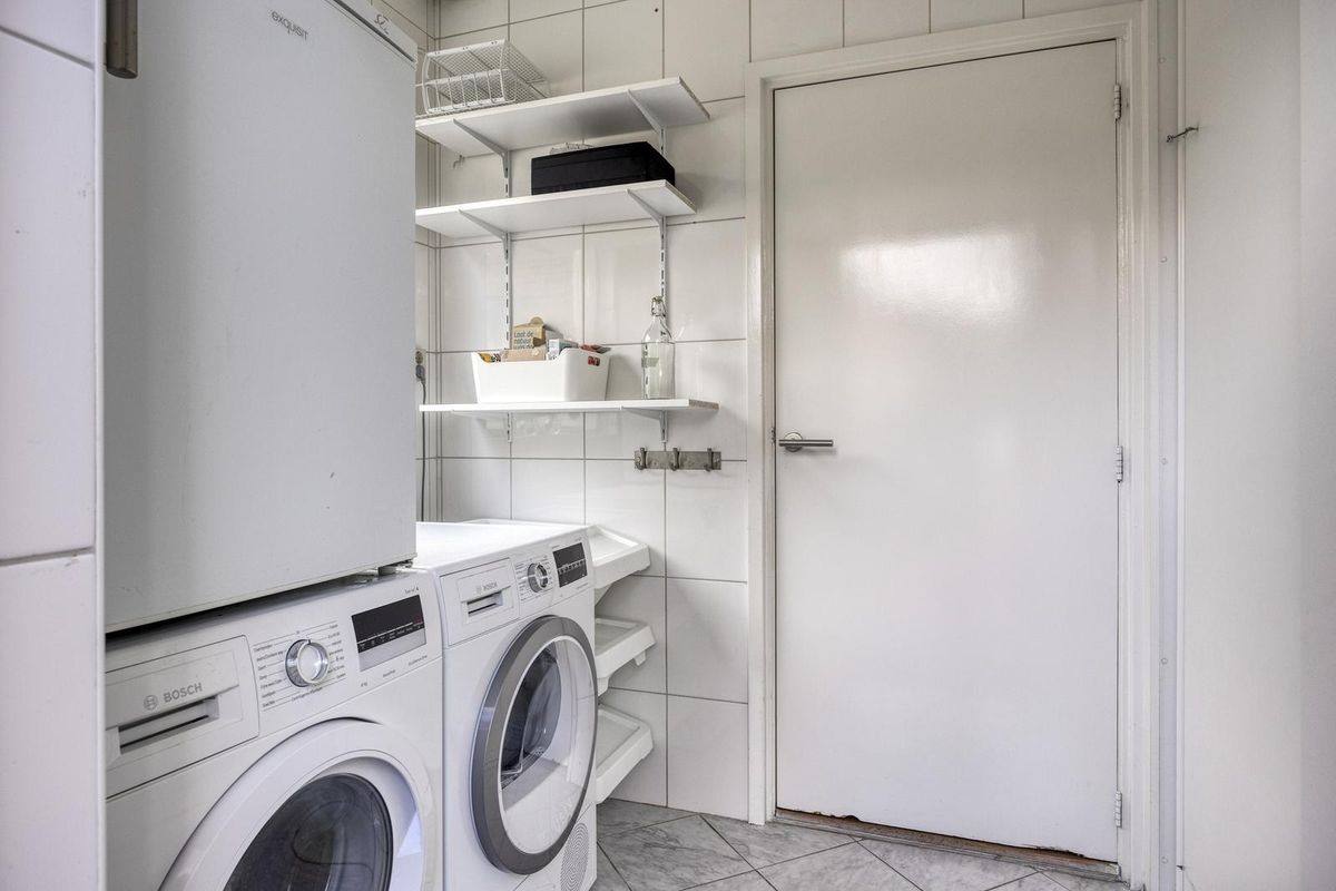 In de bijkeuken bevinden zich de aansluitingen ten behoeve van de was- en droogapparatuur en een vaste kast met schuifdeuren. De loopdeur geeft je toegang tot de tuin.