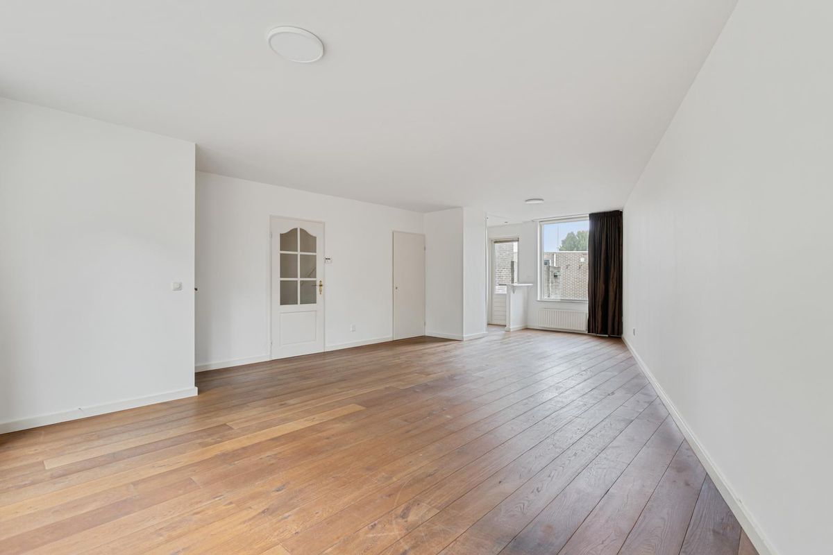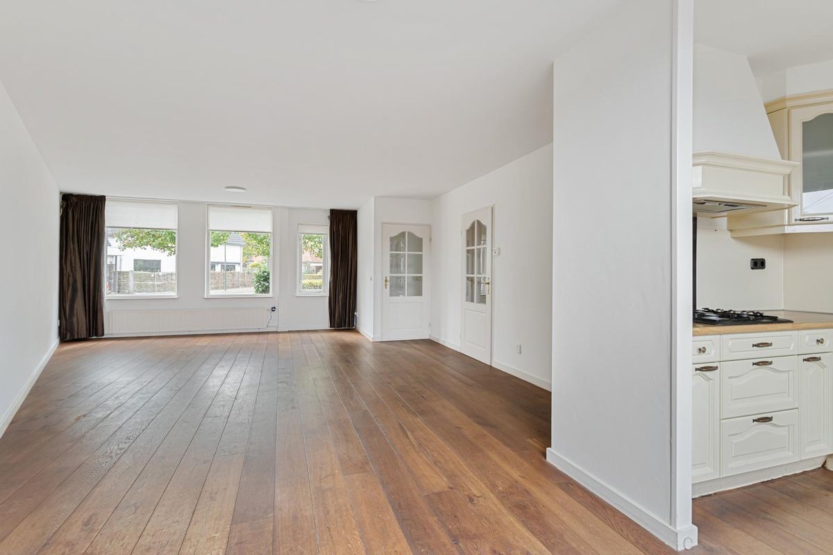 De sfeervolle woonkamer (circa 38 m2) heeft een praktische trapkast, biedt toegang tot de tussenhal en staat in open verbinding met de semi-open keuken.