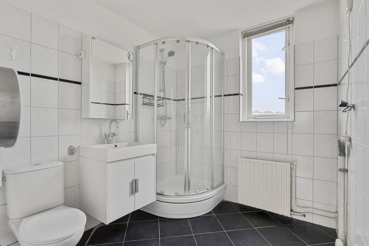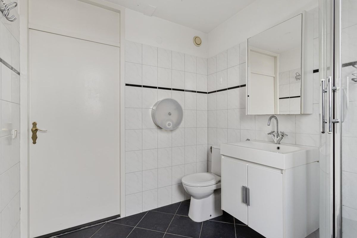 De grotendeels betegelde badkamer (circa 2.15 x 2.40 m) is voorzien van een tweede toilet, douchecabine, wastafelmeubel, spiegelkast, aansluitingen voor de wasmachine en een raam voor natuurlijke ventilatie en daglichttoetreding.