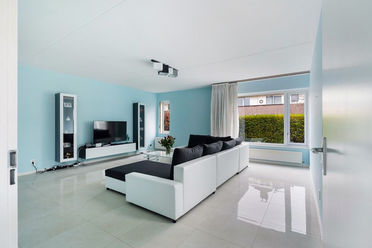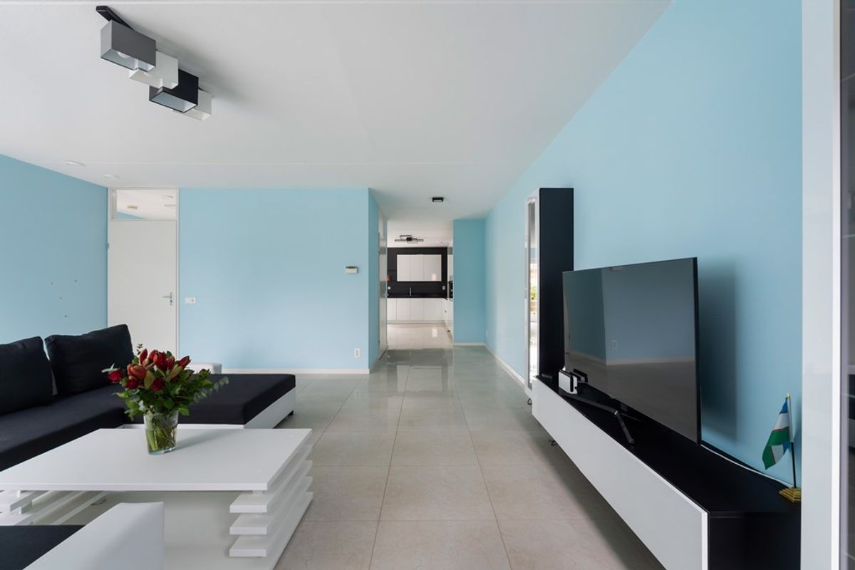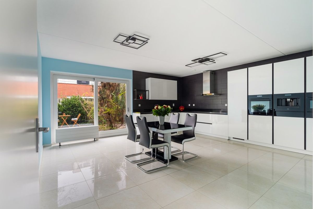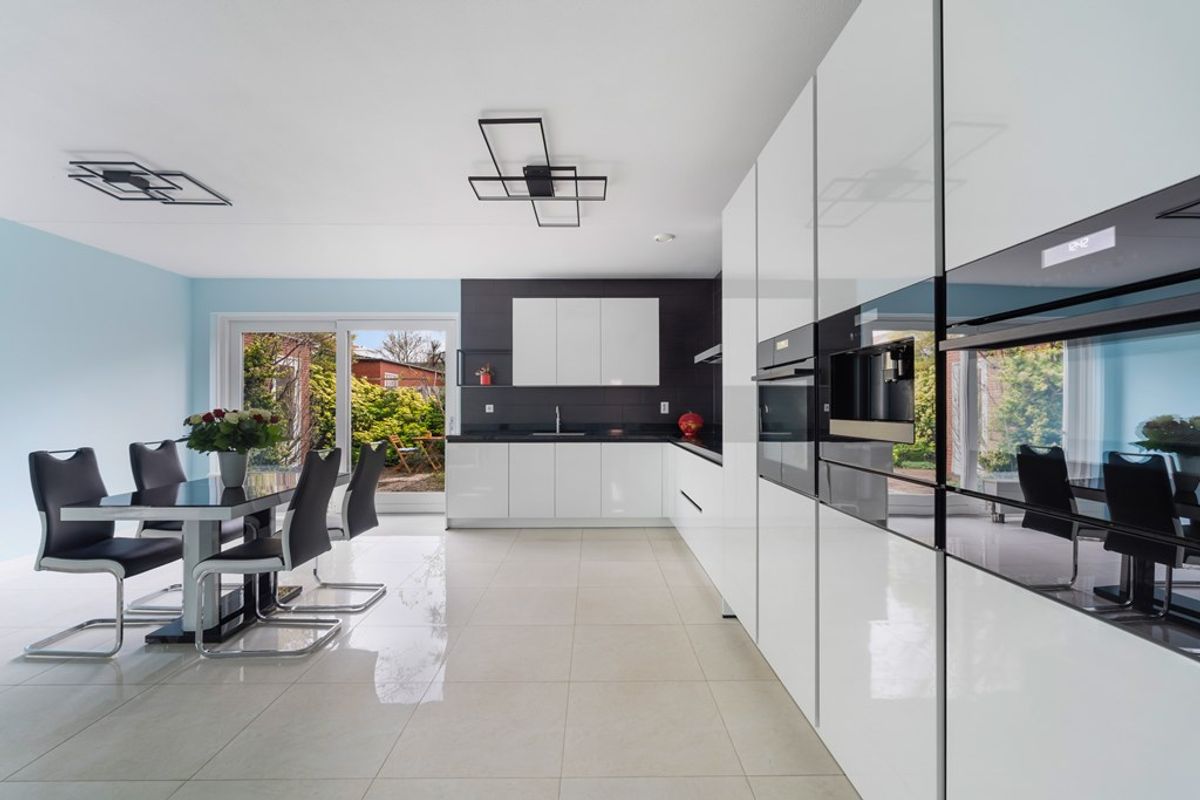 The sunny, garden-facing living room at the front of the house flows beautifully into the extended luxury kitchen at the rear — a real eye-catcher. This modern kitchen features sleek white high-gloss cabinetry, granite countertops and high-end built-in appliances, including a flexible induction hob, extractor hood, dishwasher, Quooker boiling water tap, oven, microwave, built-in coffee machine, refrigerator, separate freezer and a stainless steel sink.