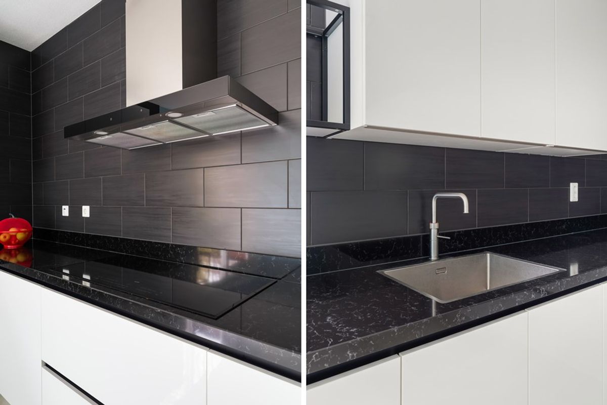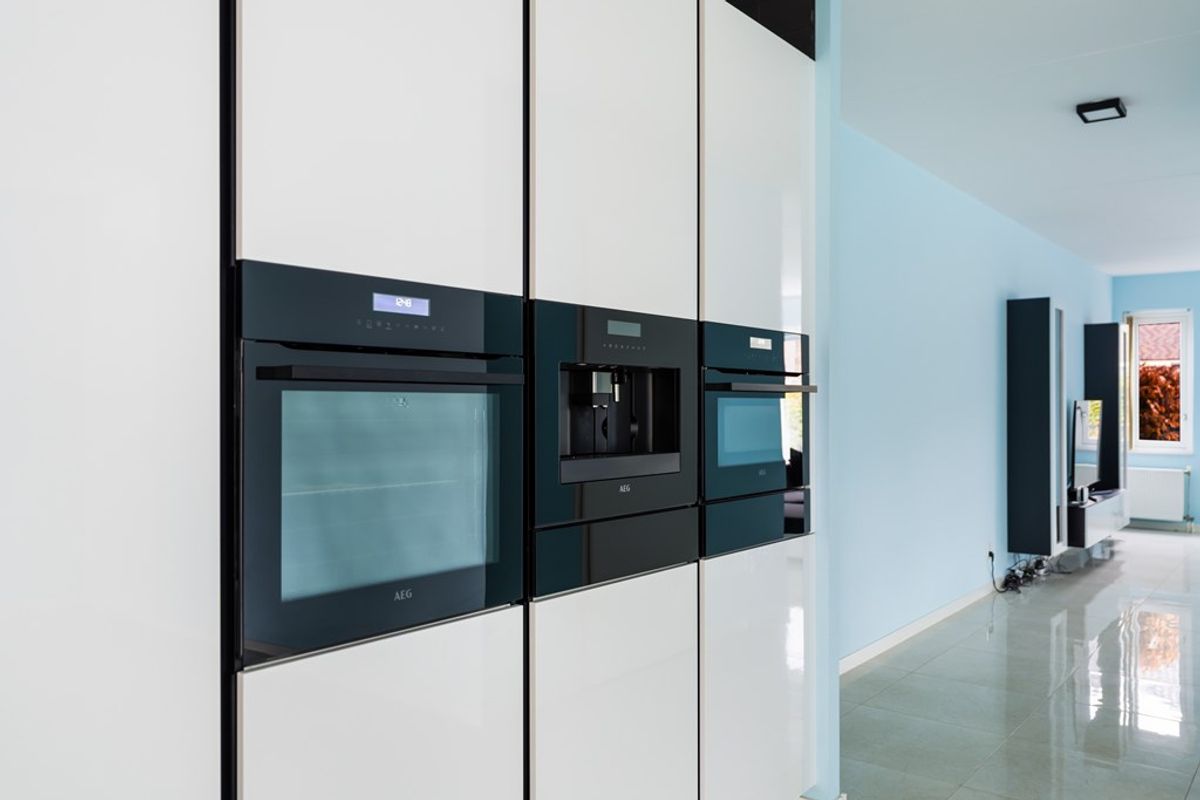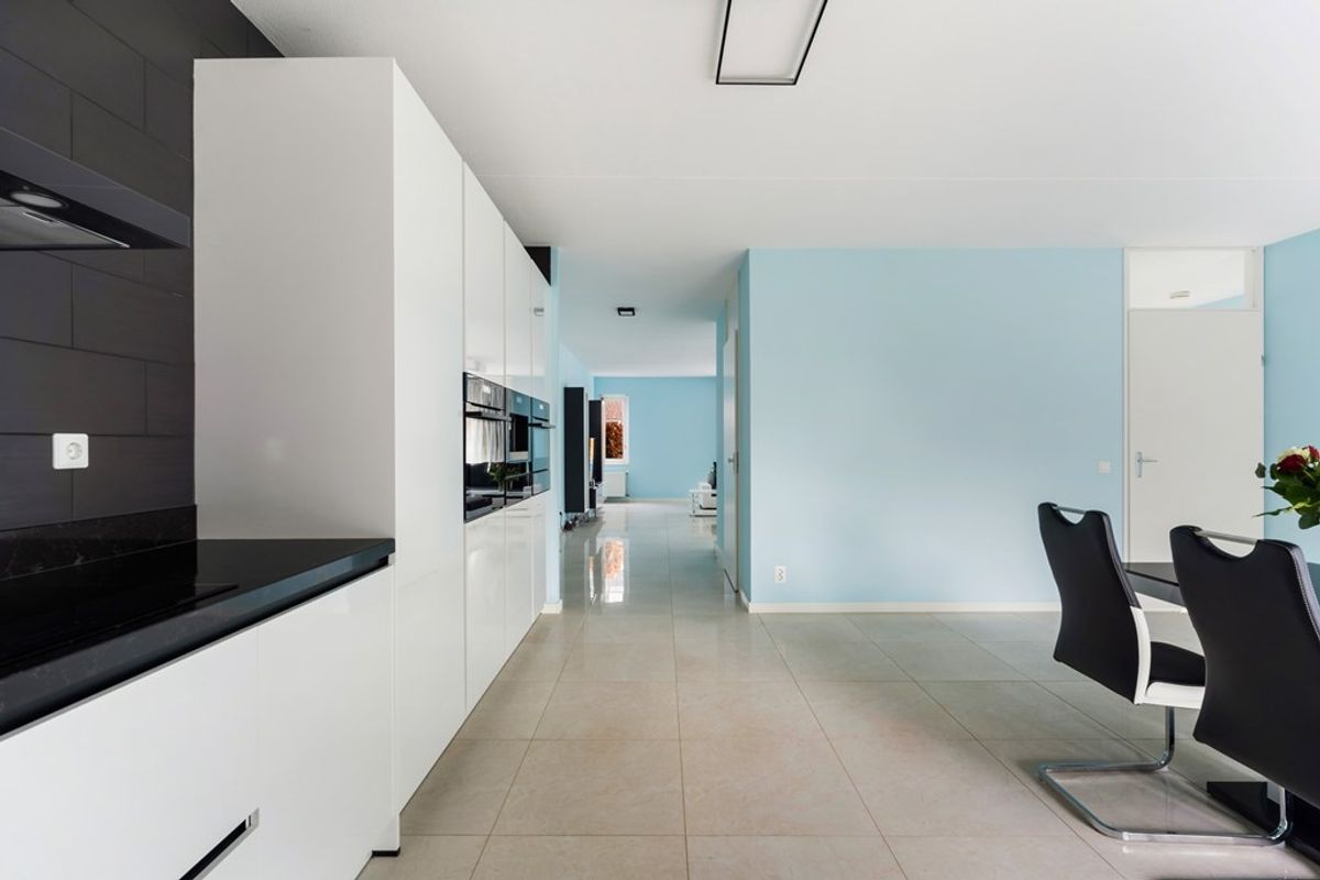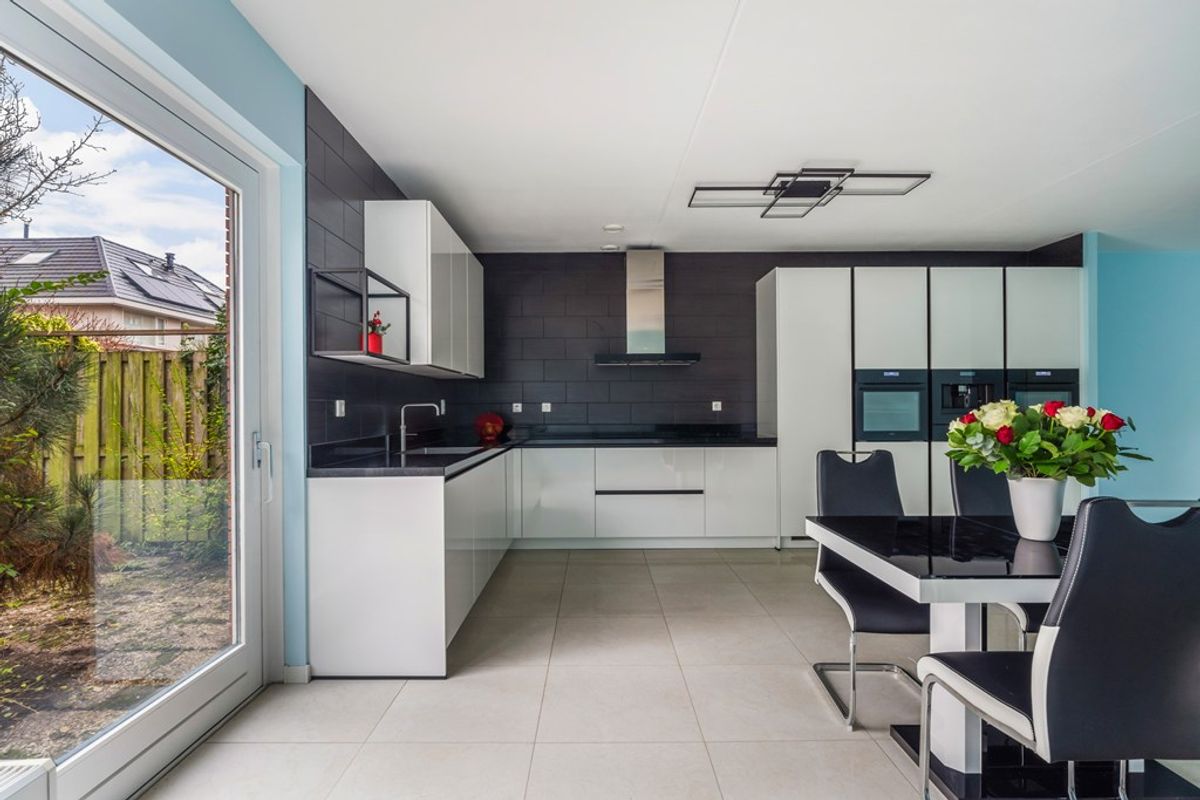 De lichte, tuingerichte woonkamer aan de voorzijde biedt volop leefruimte en sluit naadloos aan op de uitgebouwde woonkeuken — een echte eyecatcher. Hier kook je in stijl dankzij de witte hoogglans kasten, granieten werkbladen en hoogwaardige inbouwapparatuur: een flexibele inductiekookplaat, afzuigkap, vaatwasser, Quooker, oven, magnetron, ingebouwd koffiezetapparaat, koelkast, separate vrieskast en een spoelbak.