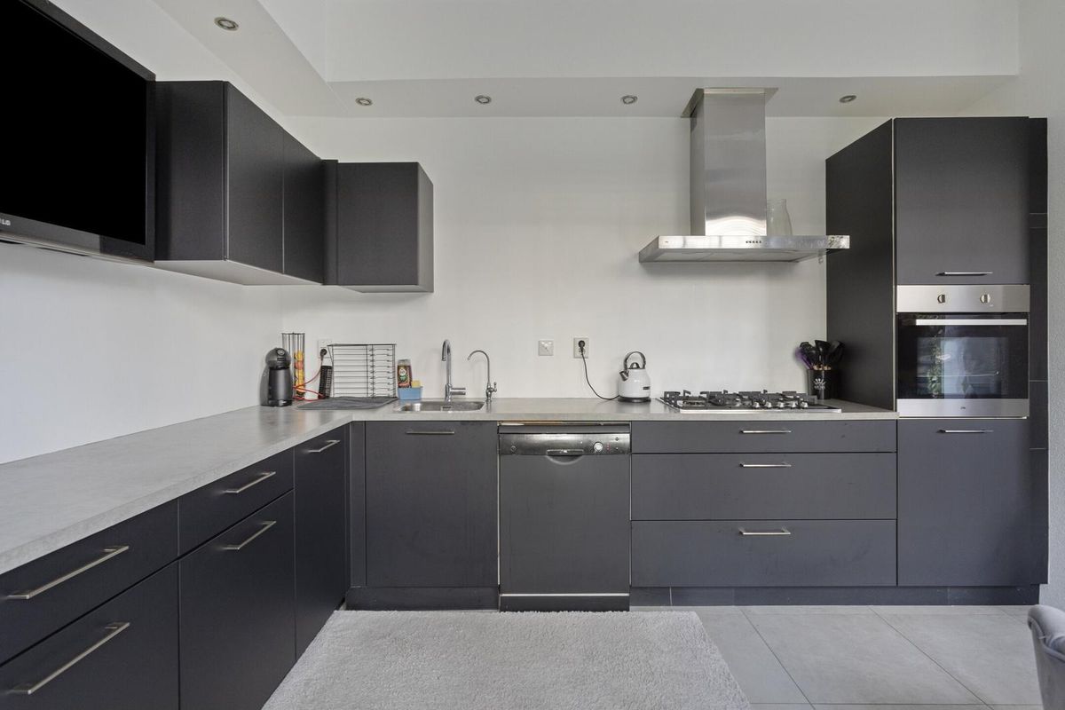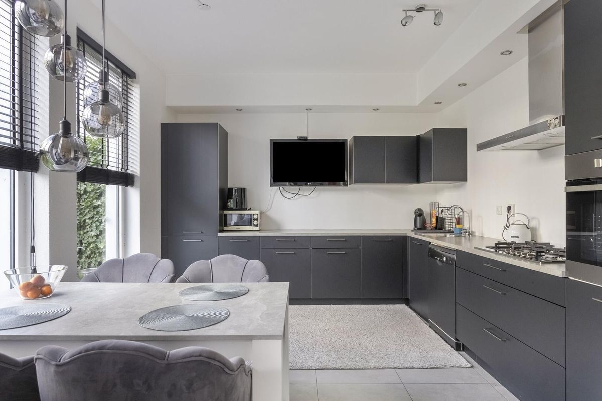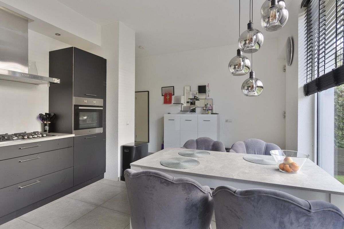 - Keuken: De moderne woonkeuken is uitgevoerd met strakke zwarte fronten en biedt volop opbergruimte. De tegelvloer met vloerverwarming zorgt voor comfort en een moderne uitstraling. Dankzij de grote raampartijen valt er veel natuurlijk licht binnen en is er ruimte voor een eethoek.