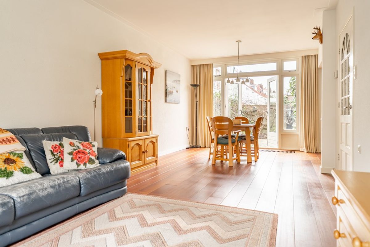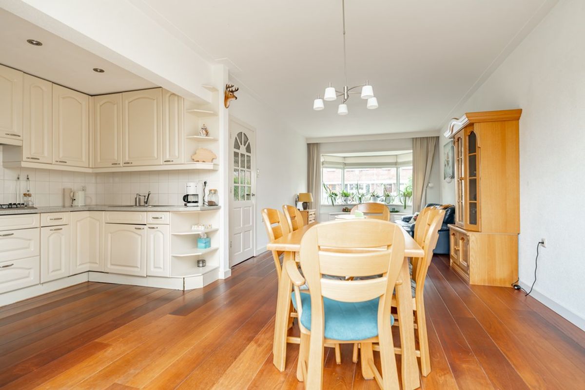 De ruime en lichte woonkamer beschikt over een sfeervolle erker aan de voorzijde, een houten vloer en gestucte plafonds. De grote raampartijen zorgen voor een prettige lichtinval en versterken het ruimtelijke gevoel. Aan de achterzijde openen dubbele deuren naar de L-vormige achtertuin, wat zorgt voor een fijne verbinding tussen binnen en buiten. De open keuken bevindt zich aan de achterzijde en is uitgevoerd in een praktische hoekopstelling met inbouwapparatuur. Aansluitend ligt de ruime bijkeuken met aansluitingen voor wasmachine en droger en toegang tot de achtertuin.