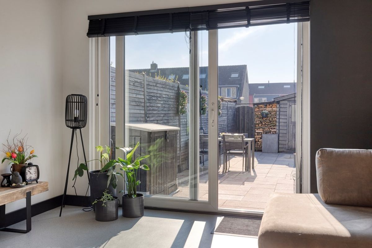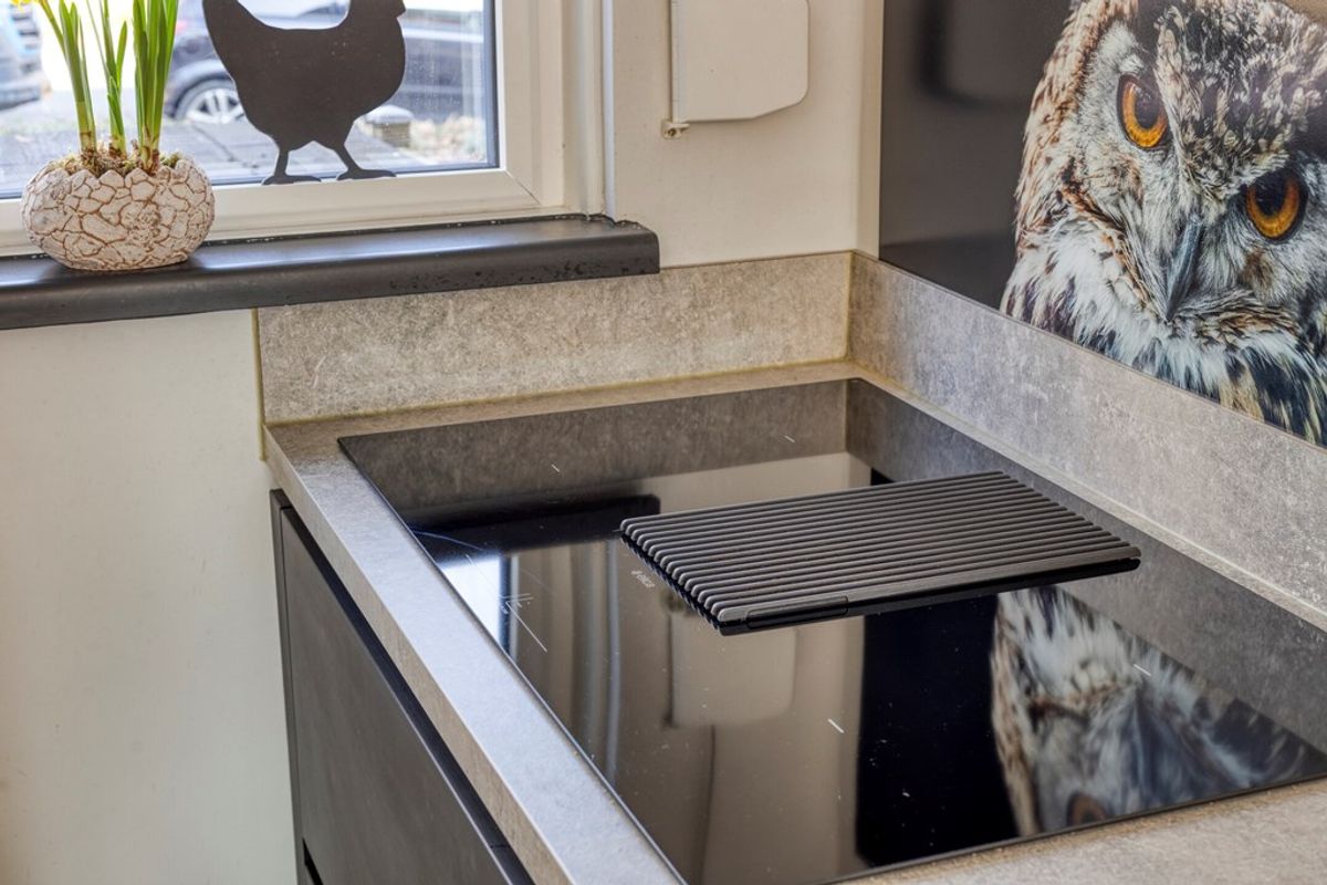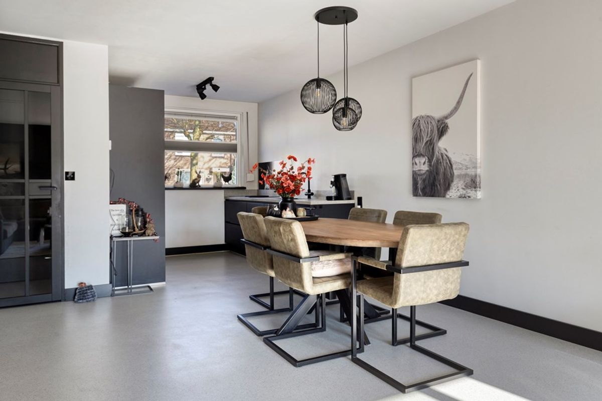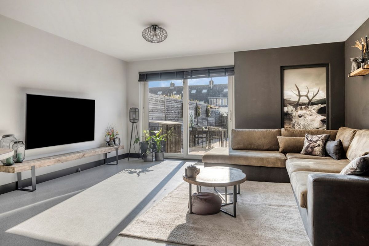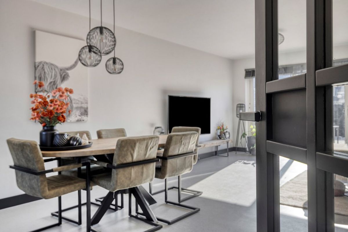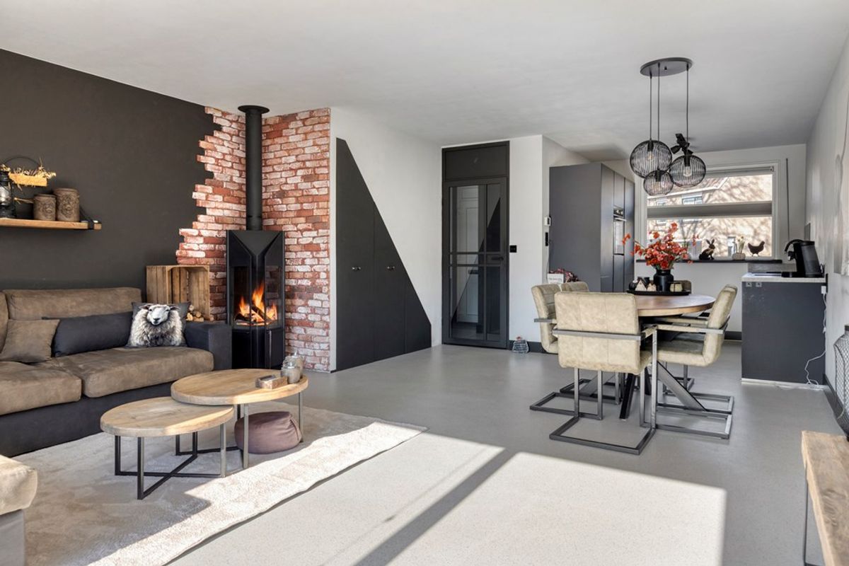 Bij binnenkomst valt direct de verzorgde afwerking op. De woonkamer is ruim opgezet en heerlijk licht door de grote raampartijen en de schuifpui richting de tuin. De moderne afwerking, de strakke vloer en de sfeervolle haard zorgen voor een warme en eigentijdse uitstraling. De open keuken sluit hier naadloos op aan en is luxe uitgevoerd.