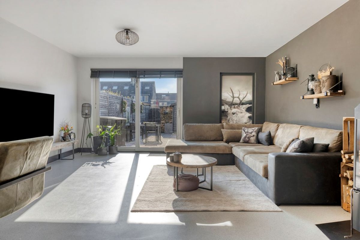 Ruime tuingerichte woonkamer met smaakvolle gietvloer met vloerverwarming. De woonkamer is voorzien van een schuifpui naar de tuin, een grote trapkast en een sfeervolle houtkachel.