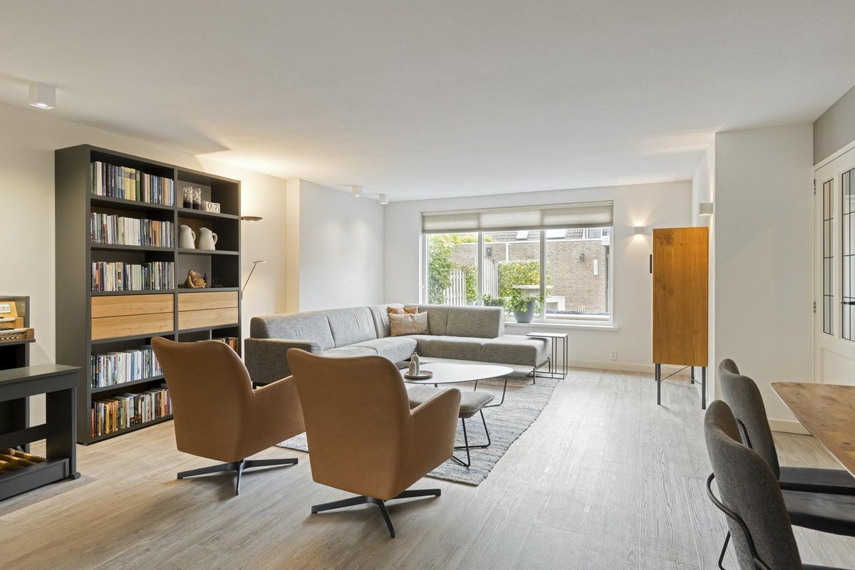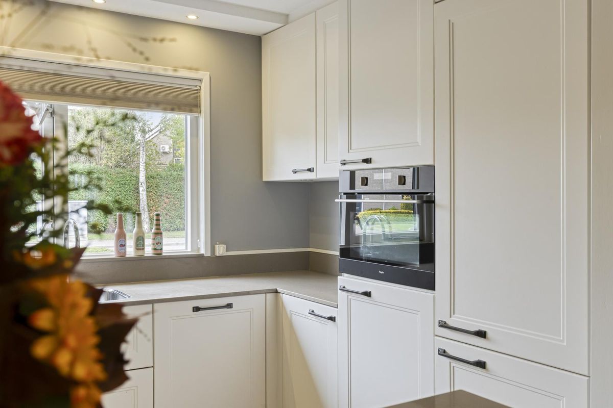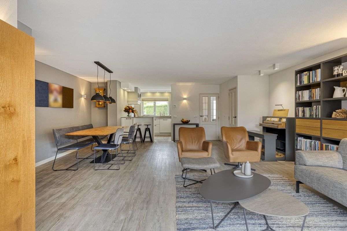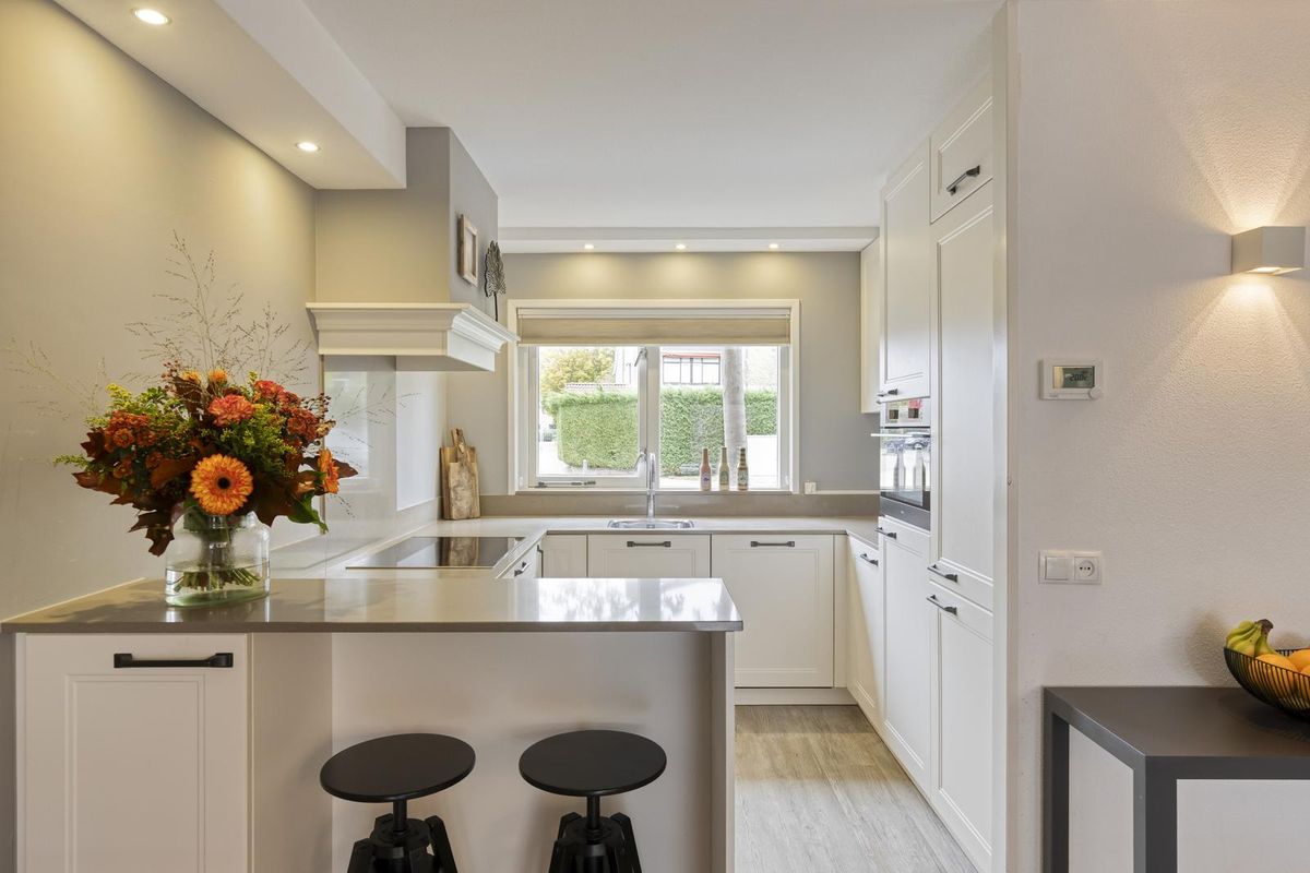 De woonkamer is royaal bemeten door de uitbouw aan de zij- en achterkant, alsmede de grote raampartij aan de achterzijde en die van de keuken aan de voorzijde. Open keuken in een U-vorm, met een gezellige ‘bar’. Hier kun je samen de dag doorspreken of bijvoorbeeld gezellig koken en tegelijkertijd huiswerk maken met de kinderen! In de woonkamer bevindt zich verder nog een trapkast en de deur naar de tweede hal aan de achterzijde, waar je ook direct toegang tot de tuin hebt.