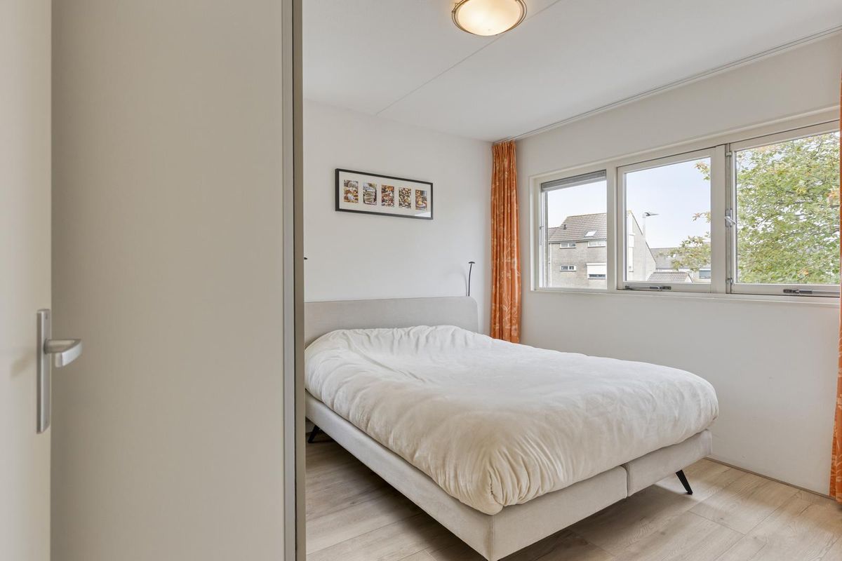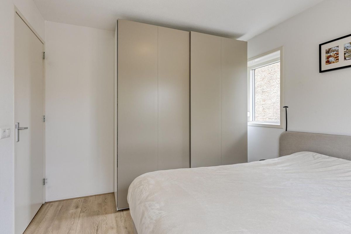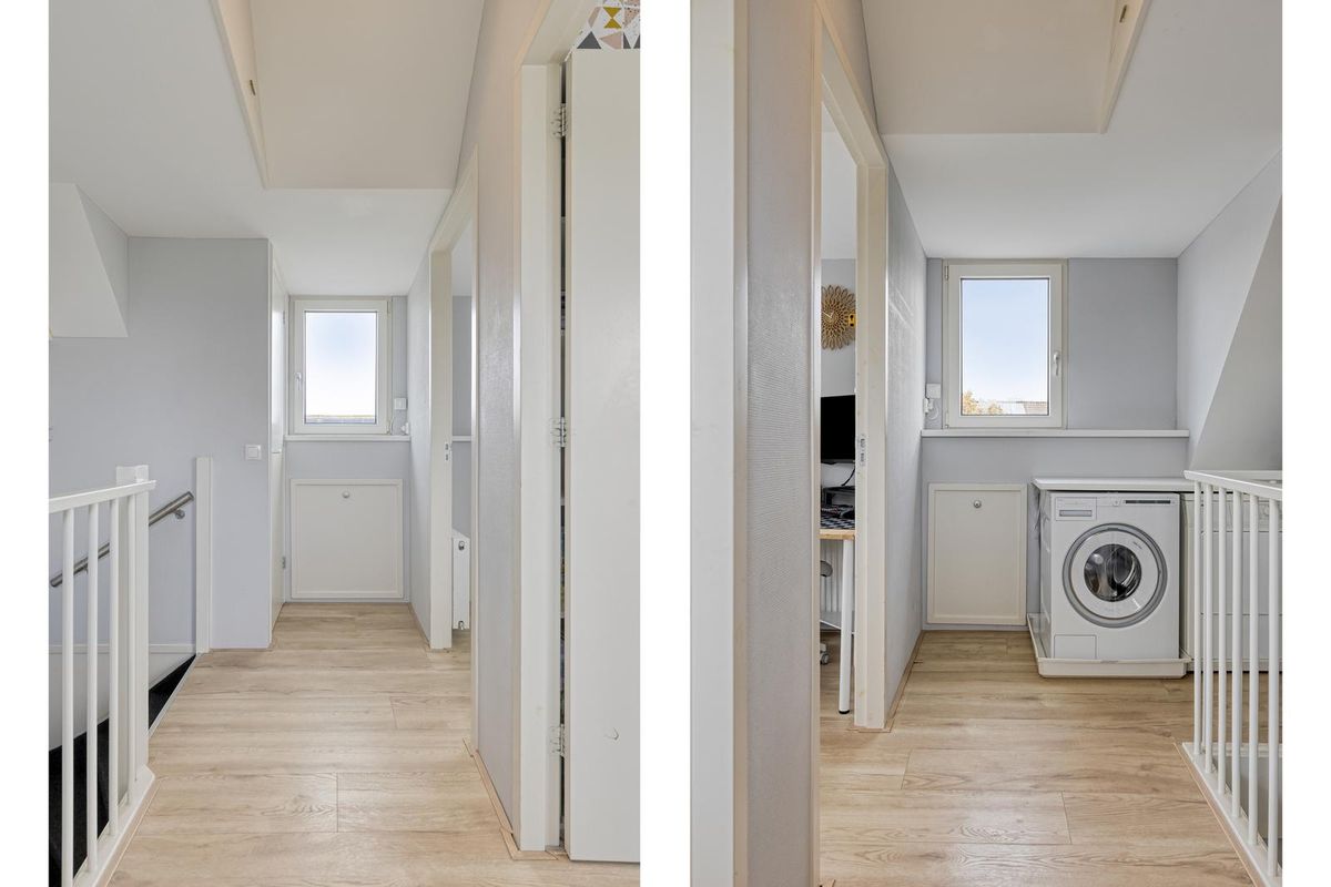 De overloop is hier voorzien van een laminaatvloer en is tevens ook waar de was/droog opstelling en CV-ketel zich bevinden. Ook is de overloop aan beide zijden voorzien van knieschotten met luik. Daarnaast hangt hier bij de trap een airconditioning, welke zowel de bovenverdieping alsmede de eerste verdieping voorziet van een aangename temperatuur in zowel de zomer als winter! Voor extra bergruimte heb je de kast nog, evenals de knieschotten en de vliering. Op deze verdieping zijn er verder nog 2 slaapkamers, beiden voorzien van een dakkapel en een vaste kast. De slaapkamer aan de achterzijde van de woning is voorzien van knieschotten met schuifdeuren.