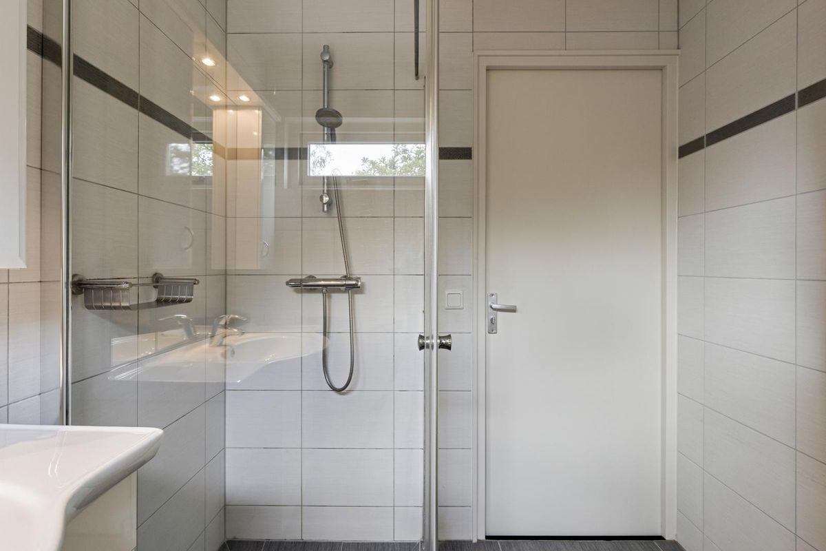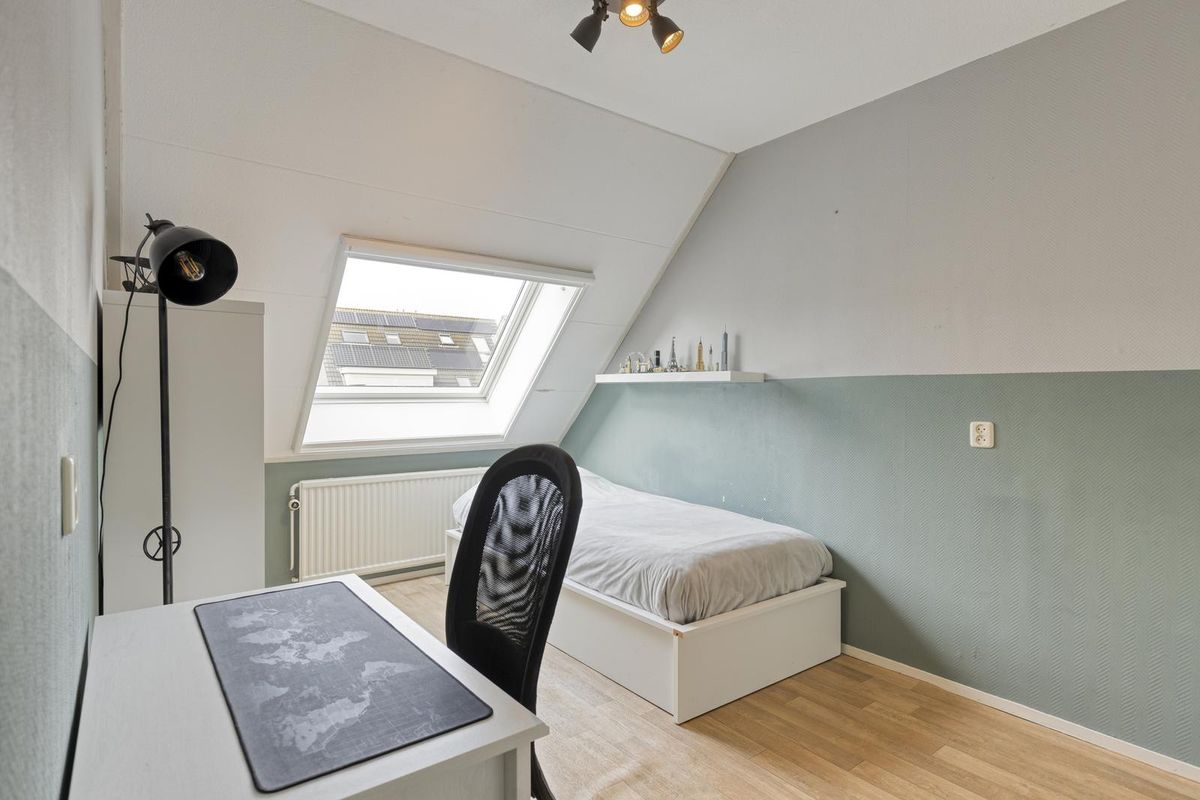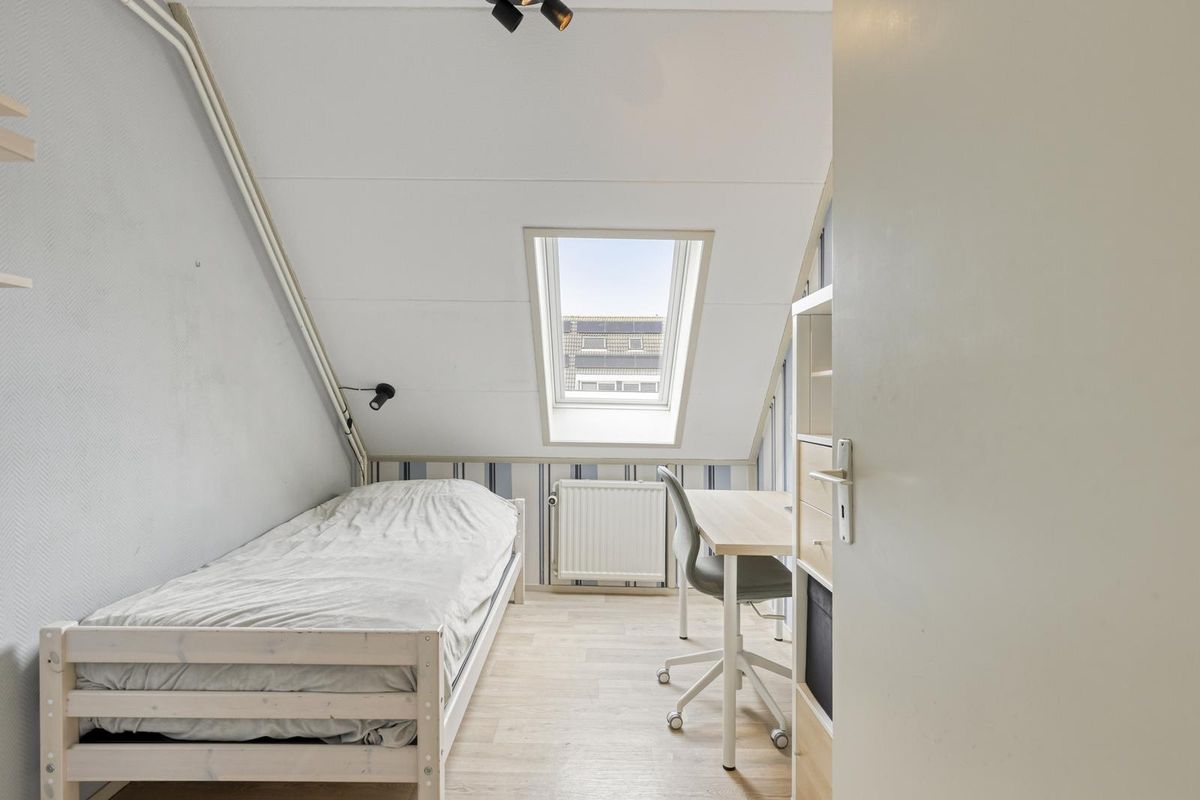 Overloop voorzien van tapijt en biedt toegang tot 3 slaapkamers en de badkamer. 2 van de 3 slaapkamers liggen aan de achterzijde en hebben beiden een groot dakraam voor veel daglicht. Ook zijn deze slaapkamers voorzien van knieschotten met luik. De 3e slaapkamer en badkamer liggen aan de voorzijde van de woning. De badkamer is voorzien van een wasmeubel, douche en een radiator.
