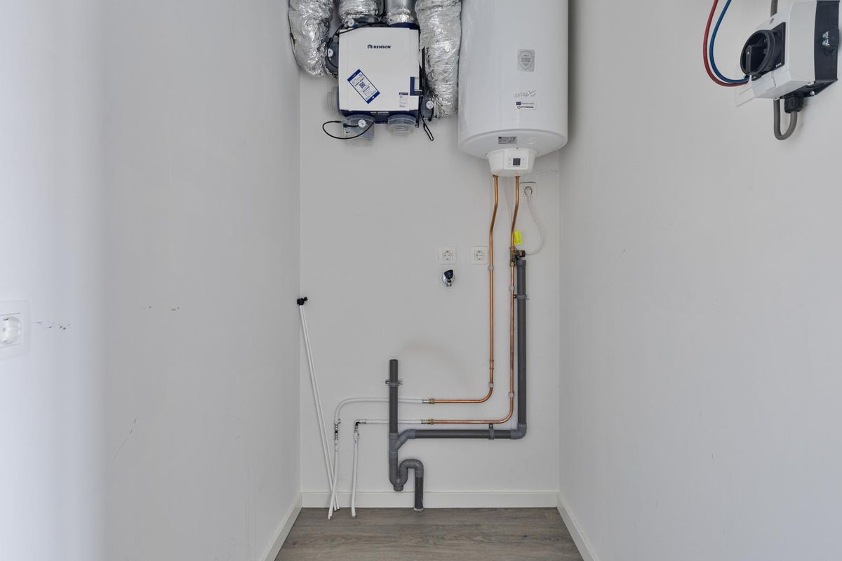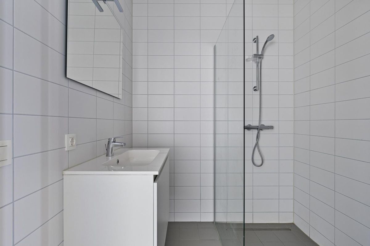 Bij binnenkomst tref je de meterkast en een apart hangtoilet. Verderop in de hal bevindt zich de moderne badkamer, uitgerust met een inloopdouche, een wastafel met meubel en spiegel. Een ruime slaapkamer met laminaatvloer.