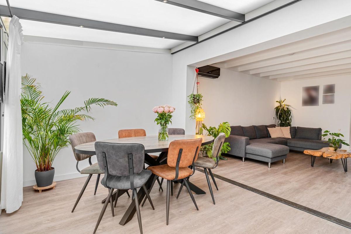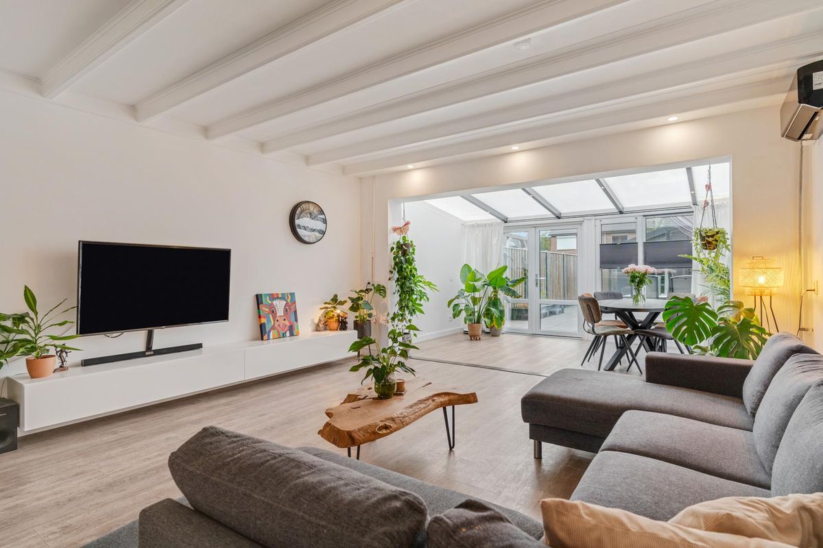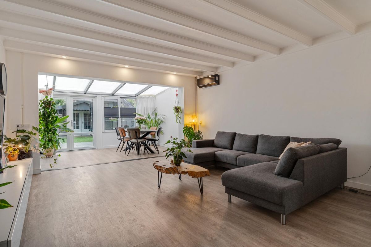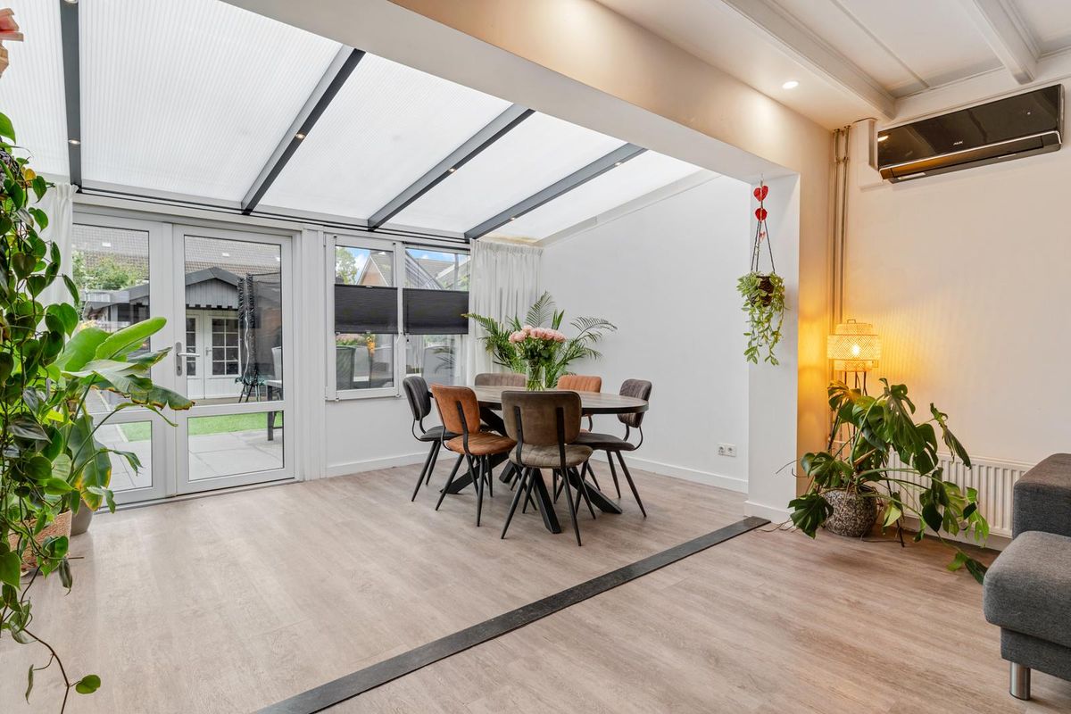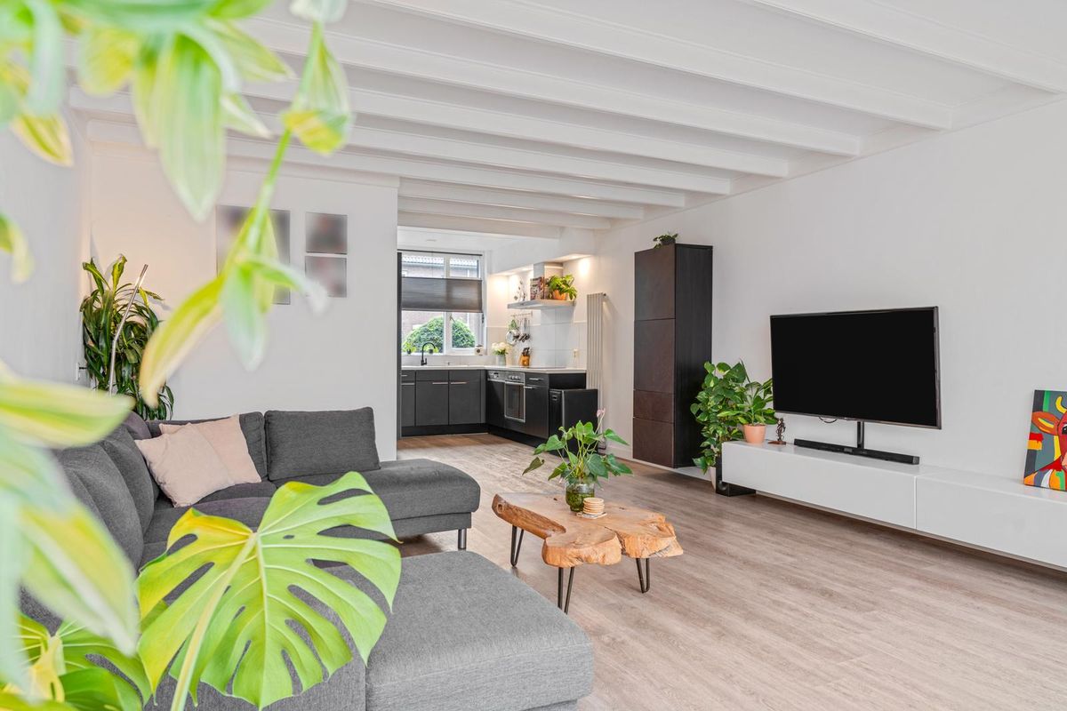 De woonkamer is verrassend ruim dankzij de uitbouw en lichte serre. De karakteristieke balkenplafonds geven de ruimte sfeer en karakter, terwijl de PVC-vloer met vloerverwarming en de strakke, neutrale wandafwerking zorgen voor een moderne uitstraling. In de serre geniet u van veel daglicht dankzij de kunststof kozijnen met triple glas. ’s Avonds zorgen de ingebouwde spots voor een gezellige ambiance.