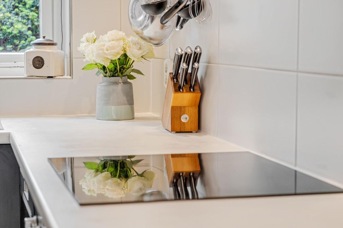 De keuken biedt niet alleen voldoende kastruimte voor al uw kookgerei, maar ook een praktische werkruimte om uitgebreid te koken of snel iets klaar te maken. De witte wandbetegeling en subtiele spots zorgen voor een frisse, moderne uitstraling die bij iedere woonstijl past.