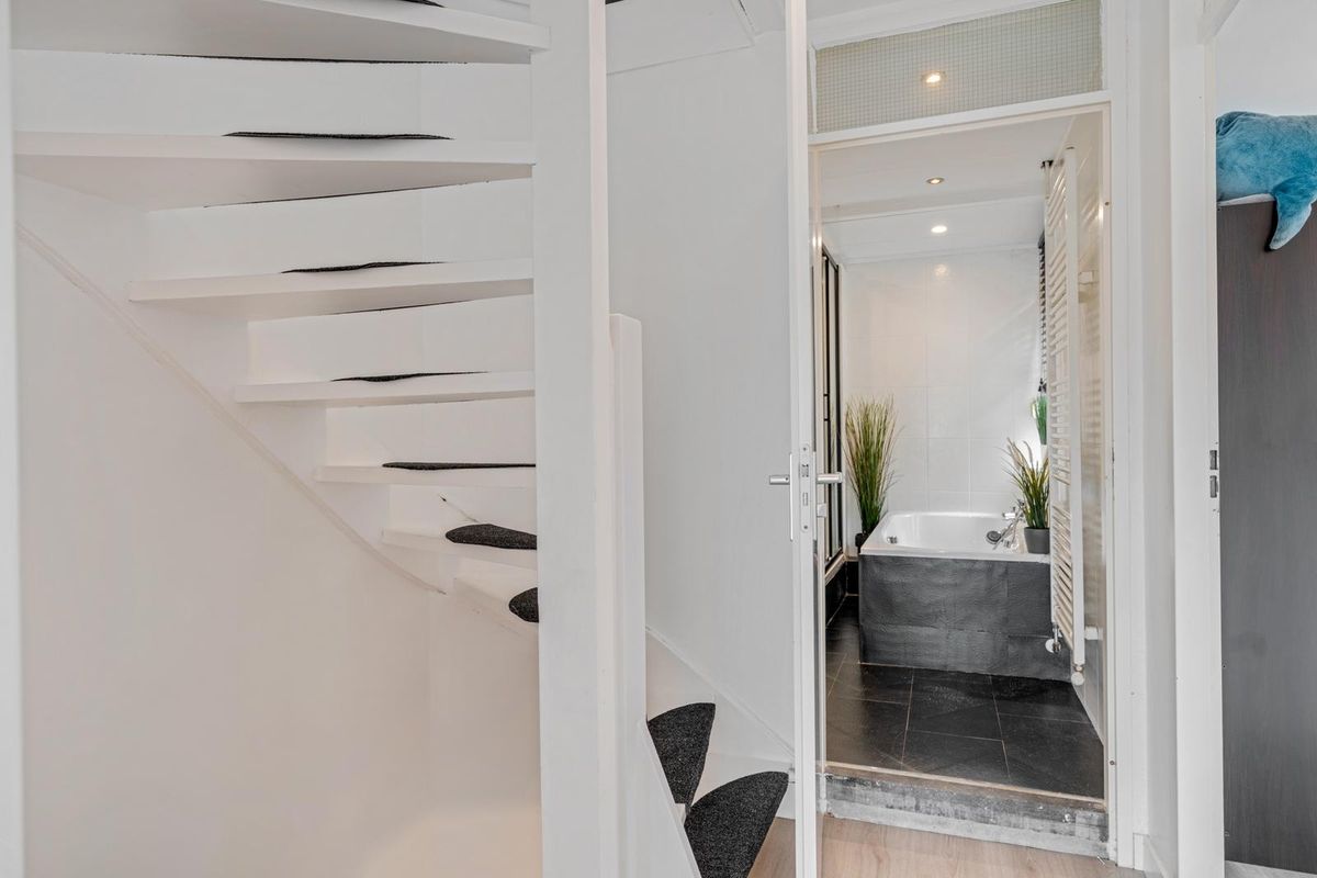 De badkamer is royaal en stijlvol ingericht. Witte wandtegels worden gecombineerd met een donkere vloer en zwarte accenten zoals een wastafelmeubel met zwarte kraan en een designradiator. U beschikt hier over een ligbad met lage instap, een moderne douchecabine met regendouche, een toilet en een groot raam (met handmatig rolluik) voor natuurlijke ventilatie. Kortom: een plek waar u heerlijk kunt ontspannen na een drukke dag.