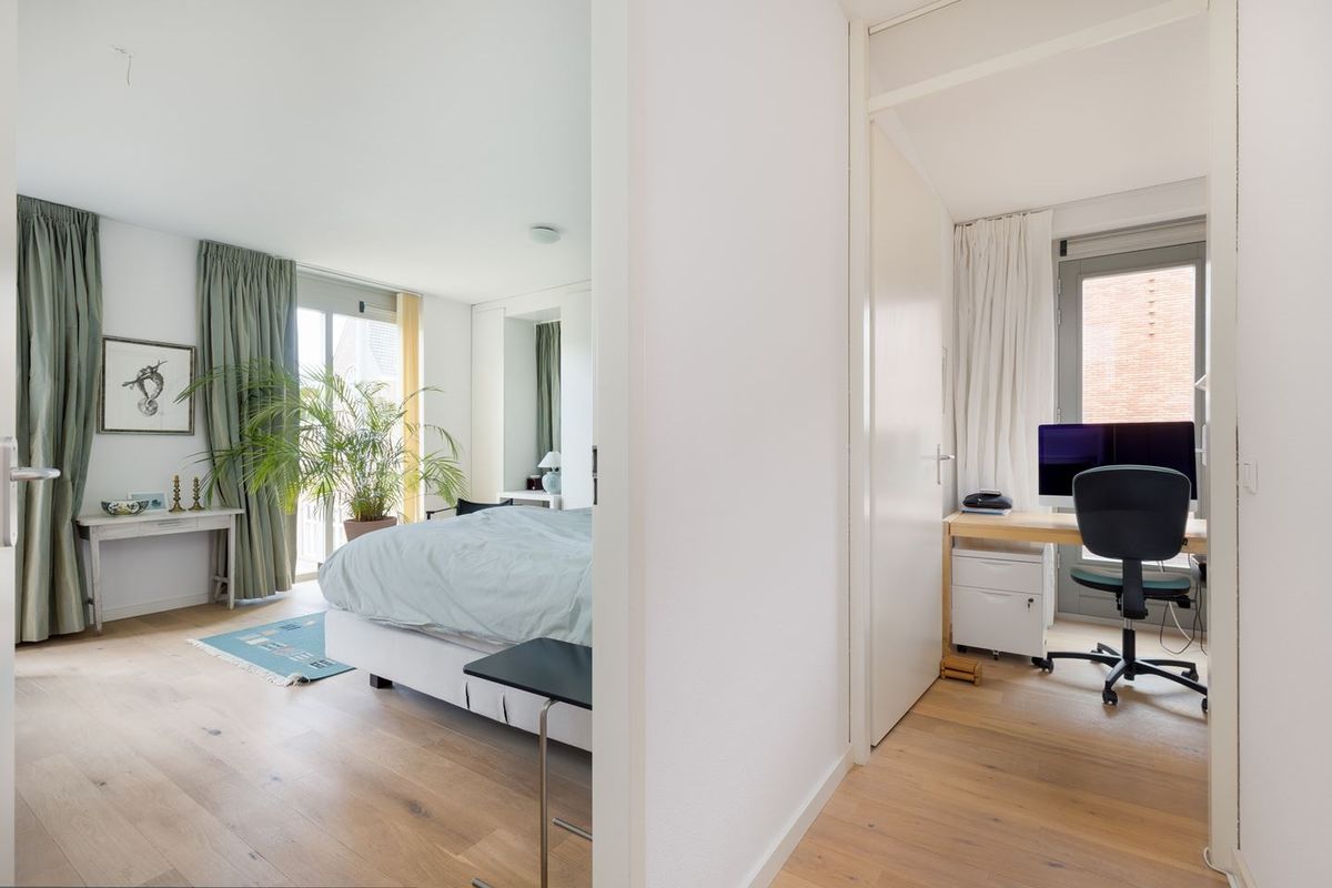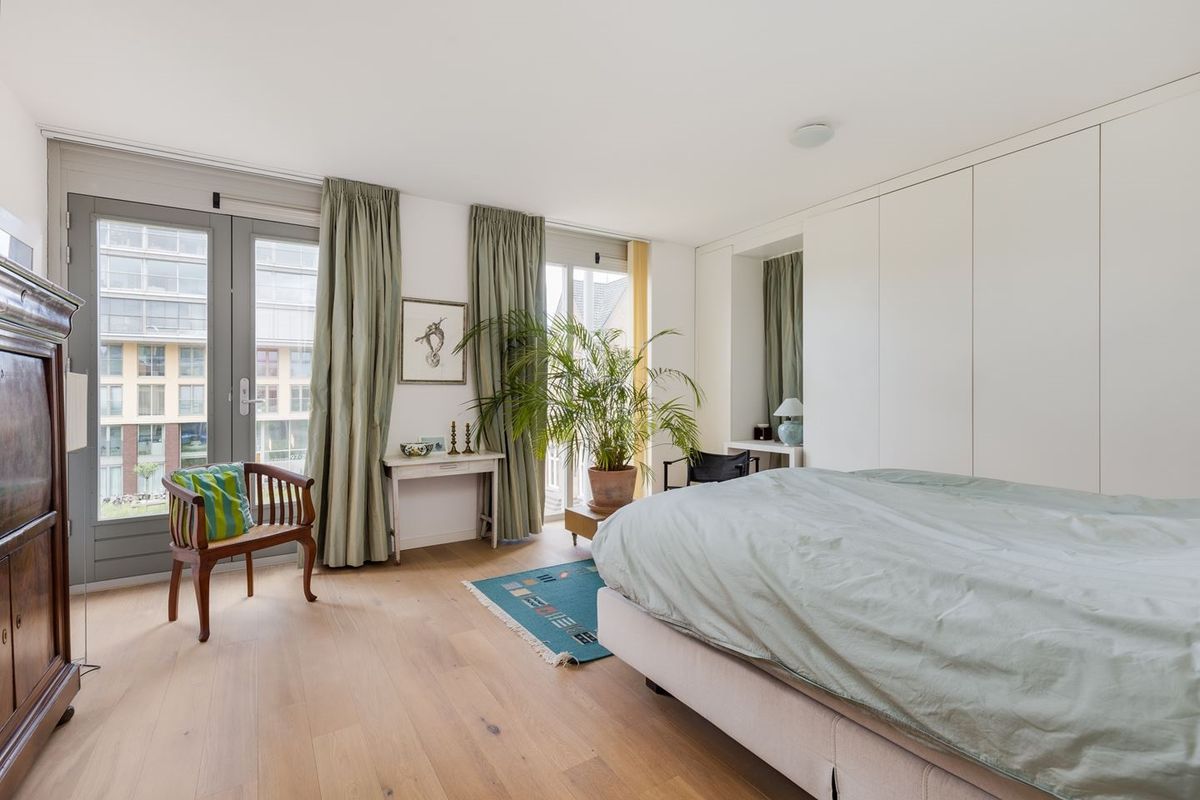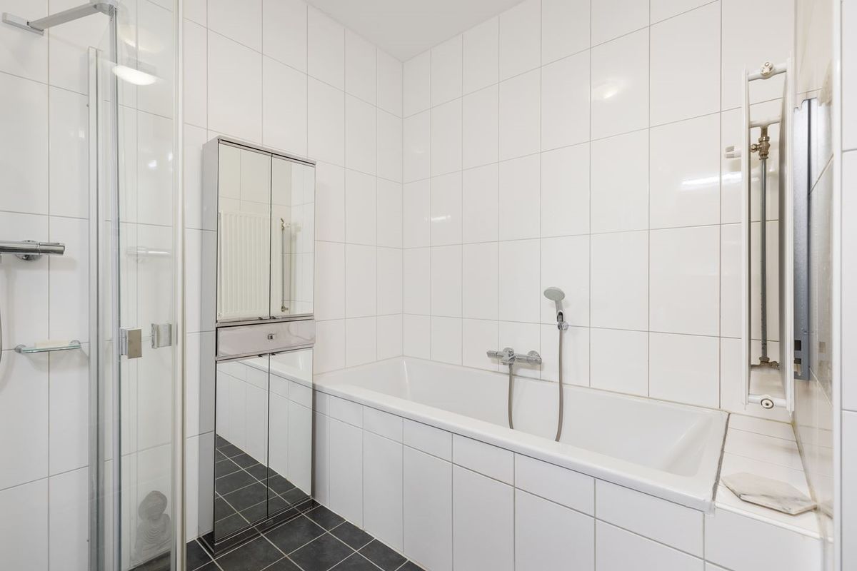 Badkamer met ligbad, aparte douche en wastafel. Woonkamer met grote raampartijen tot de vloer, wat zeer ruimtelijk en licht oogt. De ruimte beschikt over Franse balkons, waardoor in de zomer buiten naar binnen gehaald kan worden.