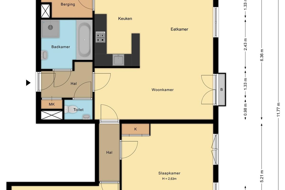 De open keuken is voorzien van inbouwapparatuur als vaatwasser, inductiekookplaat, oven en afzuigkap. Grenzend aan de woonkamer is de wasruimte gelegen, welke erg ruim is en ook te gebruiken is als berging.