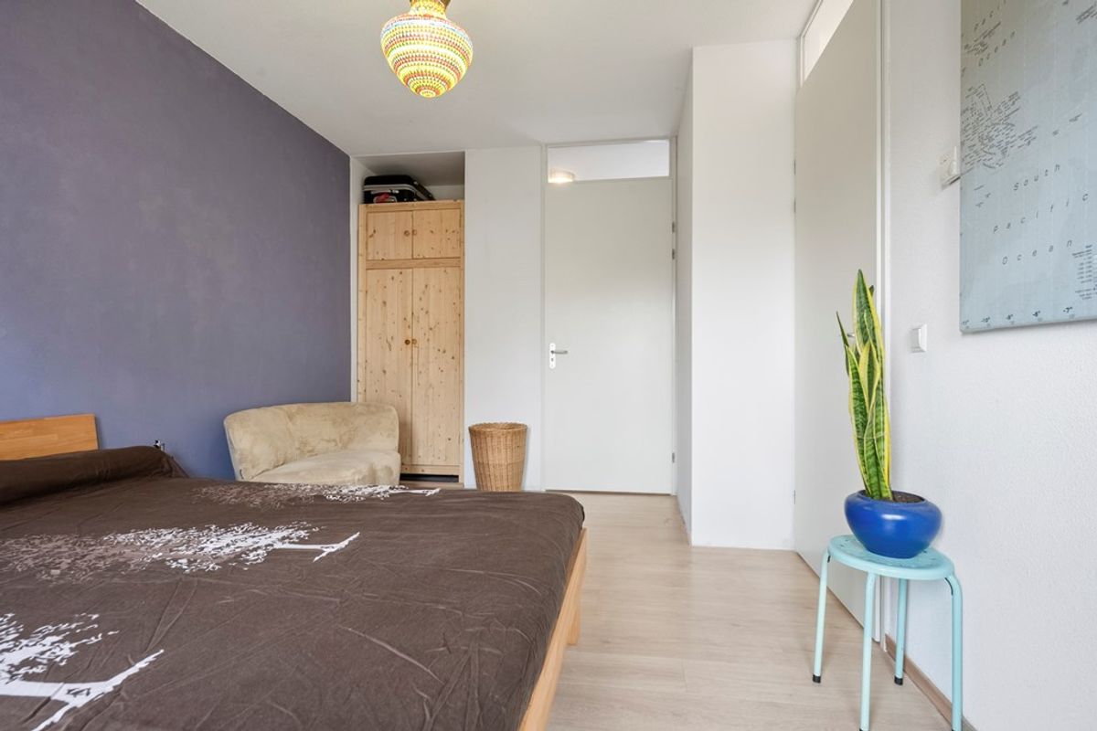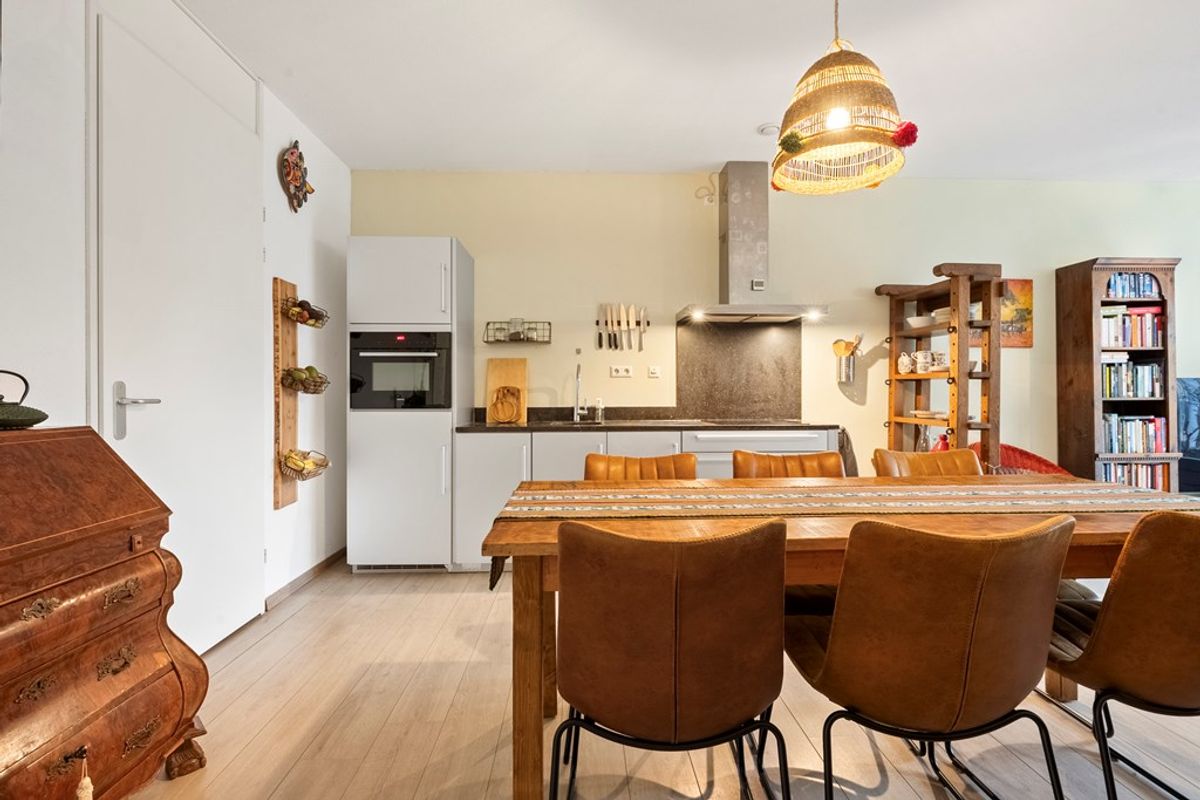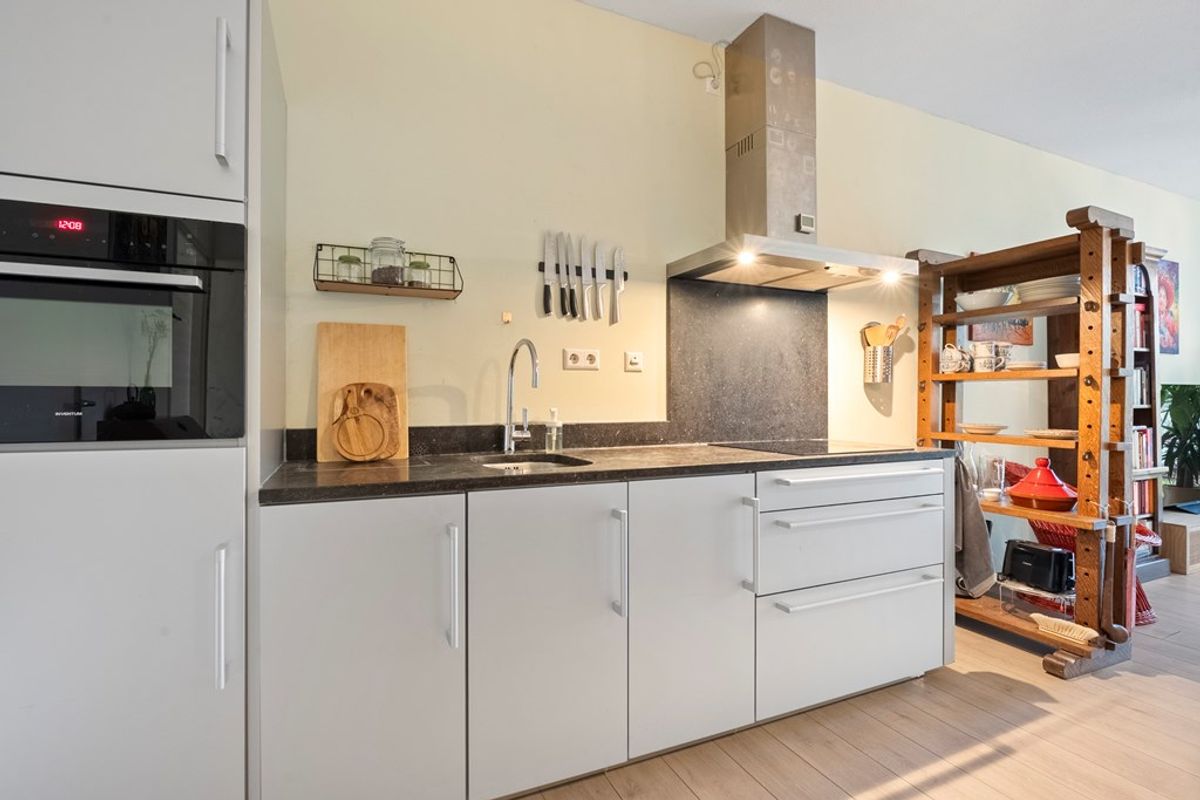 De ruime woonkamer met open keuken is praktisch ingedeeld en heerlijk licht dankzij de grote glazen pui aan de achterzijde. De keuken biedt veel werk- en kastruimte en grenst aan een inpandige berging met wasmachineaansluiting.