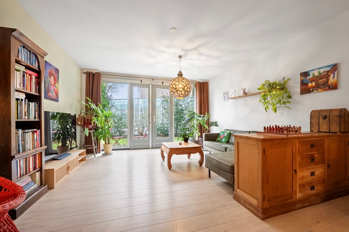 Via de openslaande deuren loop je zo de beschutte, gezamenlijke binnentuin in – een fijne plek om buiten te zitten en te ontspannen.