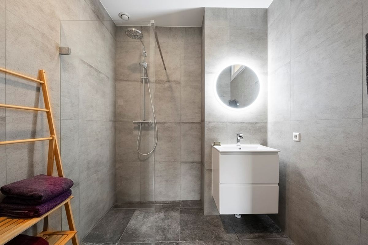 At the front of the apartment is the generous bedroom, with direct access to the neat bathroom (2023) featuring a washbasin and walk-in shower. The hallway also leads to the separate toilet.