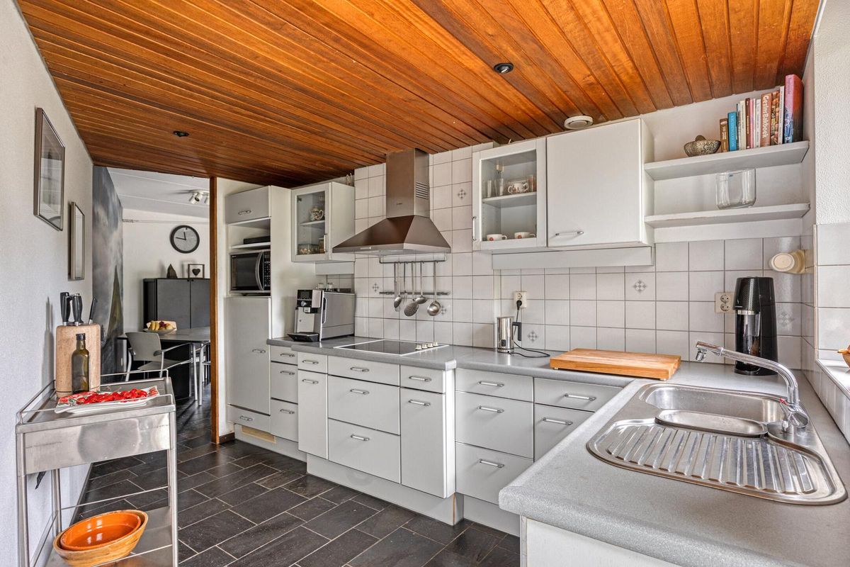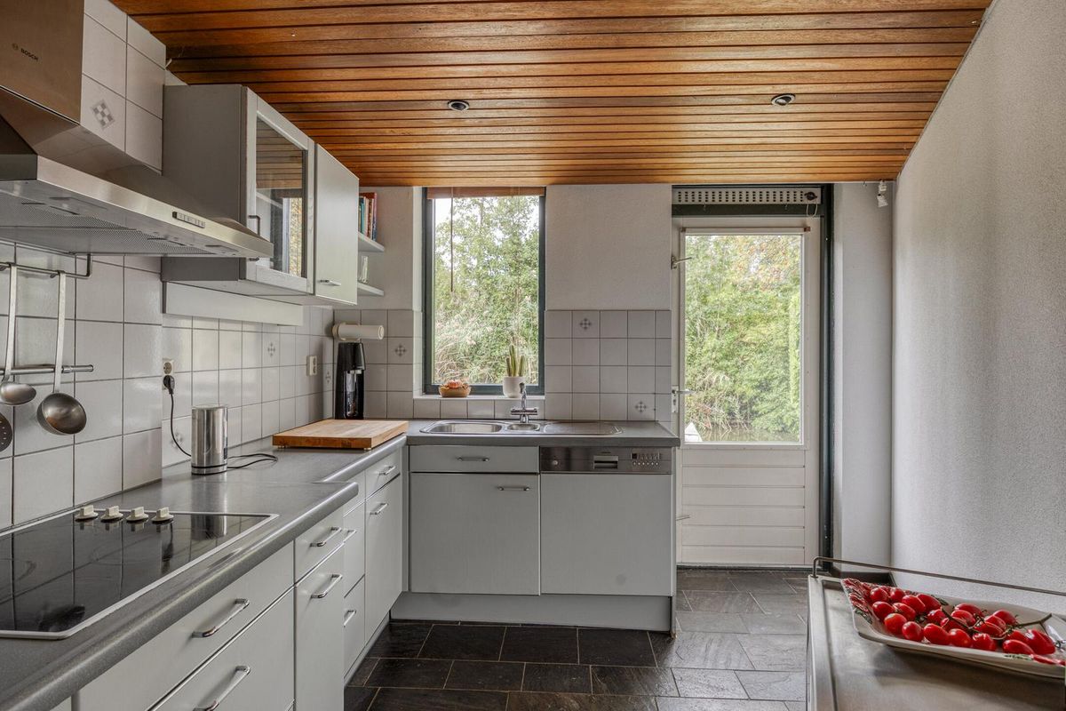 Vanuit de hal met garderobe nis, toilet en meterkast betreedt u de woonkamer. Deze is ruim opgezet en voorzien van een Noorse leistenen vloer met comfortabele en energiezuinige vloerverwarming, stucwerk wanden en een trapkast. Dankzij de grote aluminium schuifpui valt er veel daglicht naar binnen en heeft u direct toegang tot de zonnige achtertuin. Aangrenzend bevindt zich de keuken die is uitgerust met onder andere een 4-pits kookplaat, koelkast, afzuigkap en vaatwasser. Via een deur heeft u toegang tot de achtertuin.