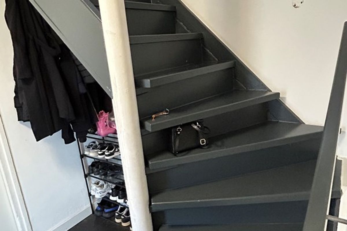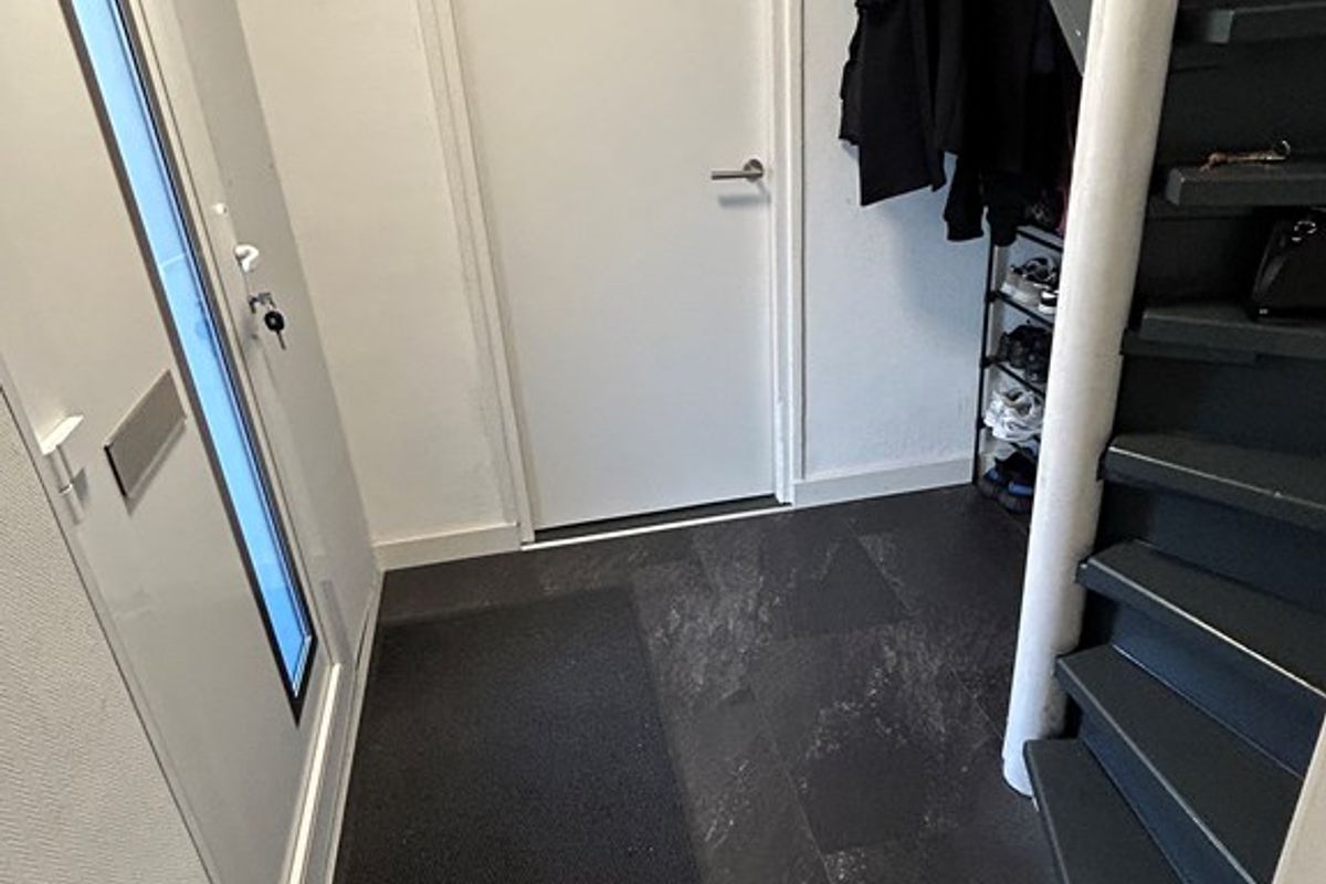 Entree/hal 2,25 x 2,05 met laminaatvloer, deur naar stookruimte en woonkamer en trap naar verdieping.