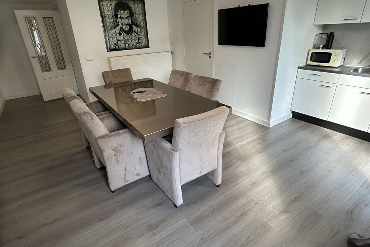 Woonkamer 7,35 x 3,85/1,70 met laminaatvloer, keukenblok, deur naar berging en achtertuin.