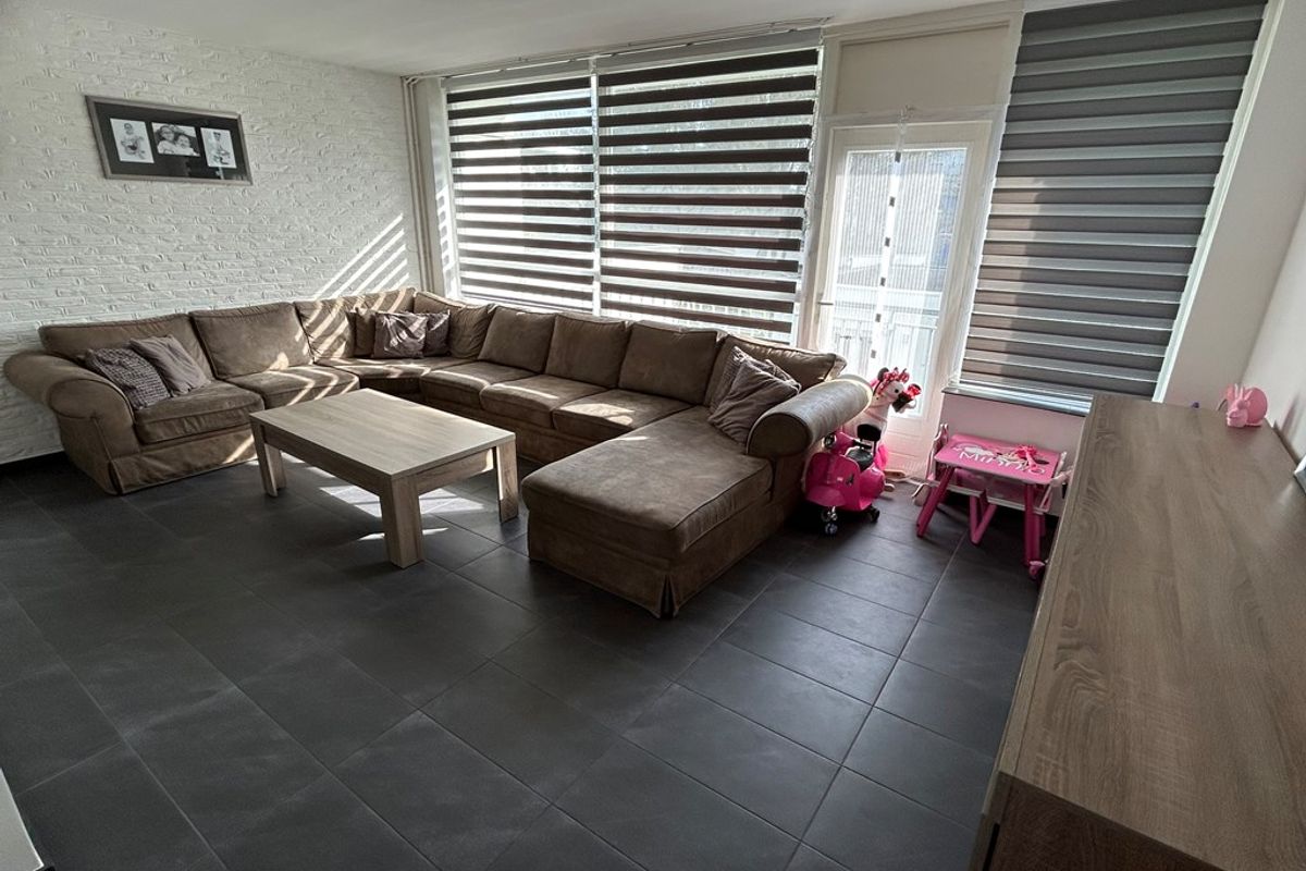 Woonkamer 5,70 x 4,20 met plavuizenvloer en deur naar balkon 5,85 x 0,95.