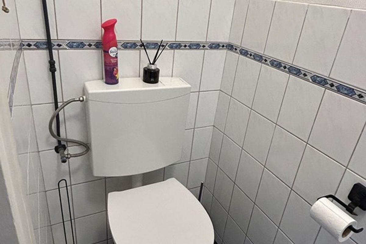 Toiletruimte 1,40 x 0,85 met plavuizenvloer en duoblok.