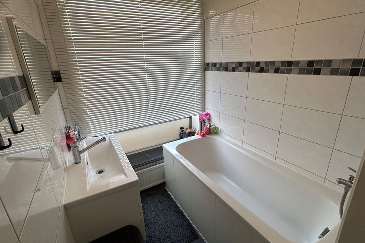 Badkamer 1,90 x 1,65 met plavuizenvloer, ligbad/douche en badkamermeubel met wastafel.