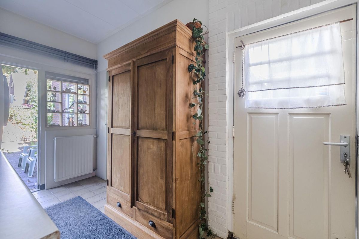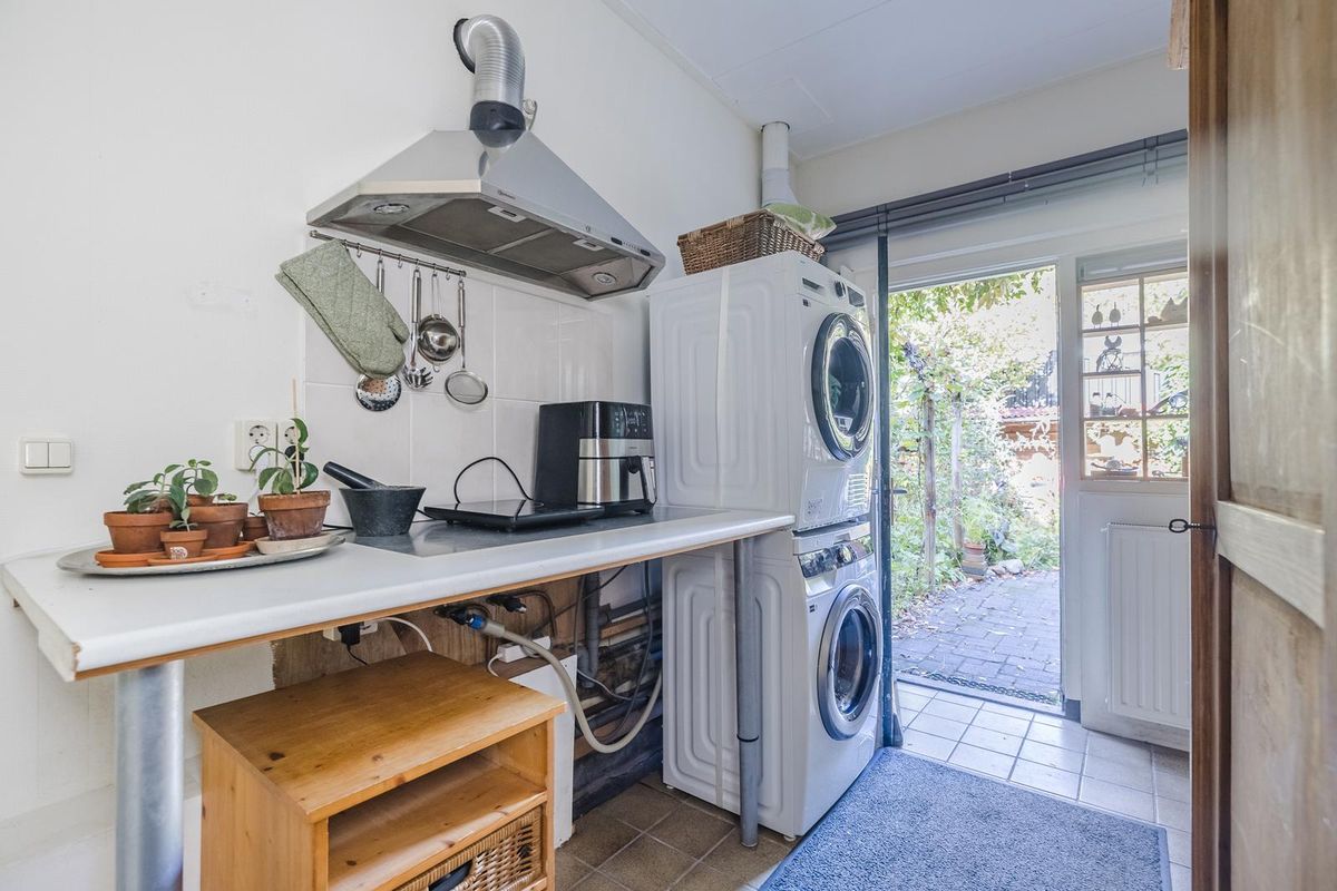 Entree met de oorspronkelijke granieten vloer en trapopgang, toilet, meterkast, kelder, lichte woonkamer met een sfeervolle houtkachel, airconditioning, openslaande deuren naar de tuin, modern uitgevoerde open keuken (2022) voorzien van diverse inbouwapparatuur, waaronder een inductiekookplaat, oven, koel-vriescombinatie, vaatwasser en een heetwaterkraan, bijkeuken met toegang tot zowel de tuin als de straat en berging en ruimte voor de HR-combiketel (Atag, 2010), de omvormer van de zonnepanelen en de wasmachineaansluiting. Daarnaast is er een berging aanwezig.