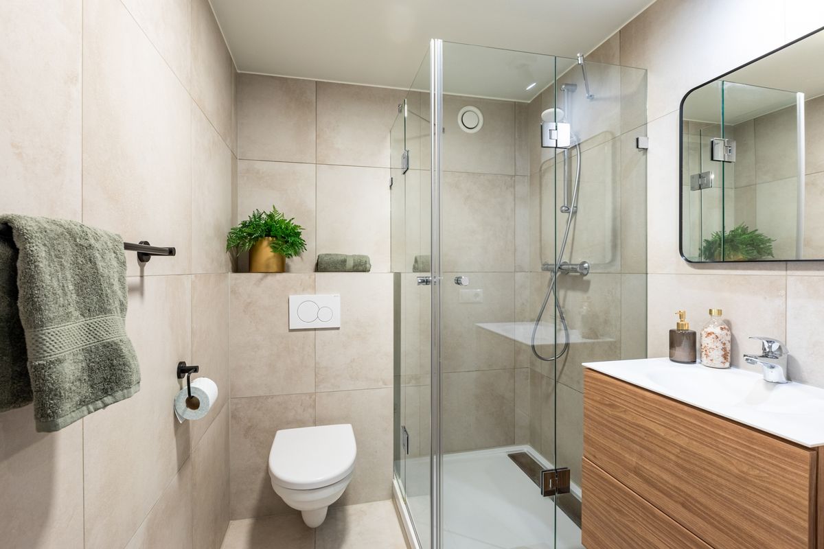 Luxury bathroom. There is a shared washing room with washers and dryers.