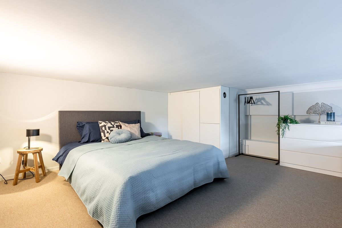 The bathroom has shower and washbasin and toilet. At the basement of the apartment is the bedroom with a double bed and a wardrobe.