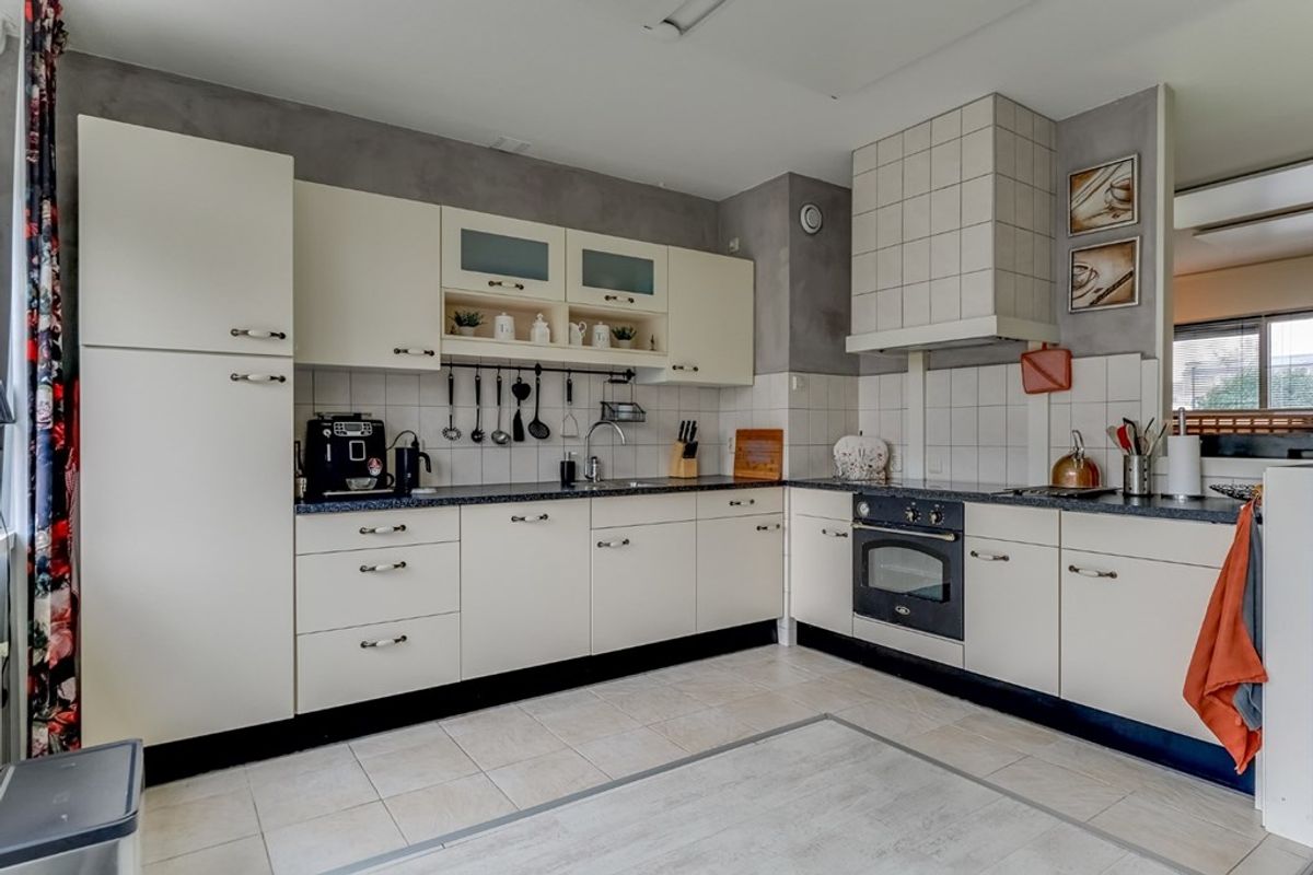 Entree/hal met meterkast, modern toilet en trapopgang, woonkamer met bergkast, royale hoekkeuken voorzien van inbouwapparatuur zoals o.a. inductiekookplaat, oven, koel kast en vriezer.