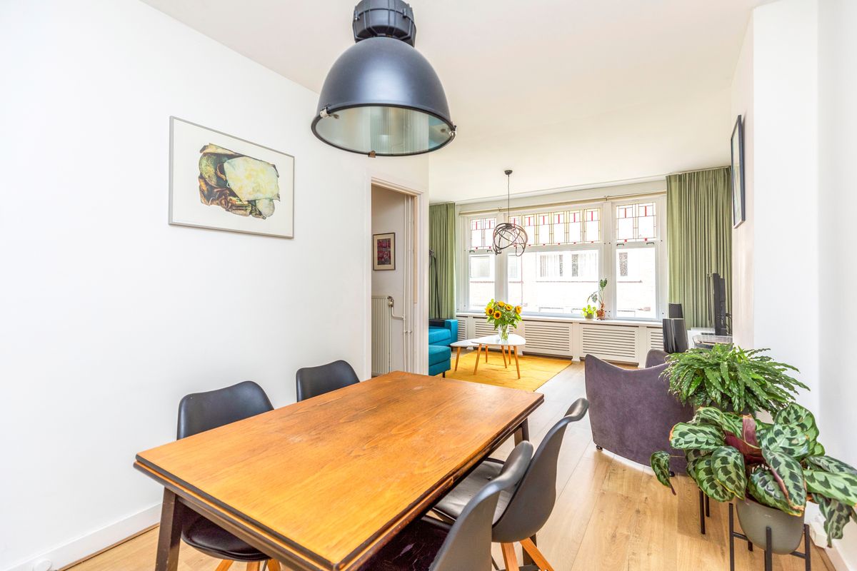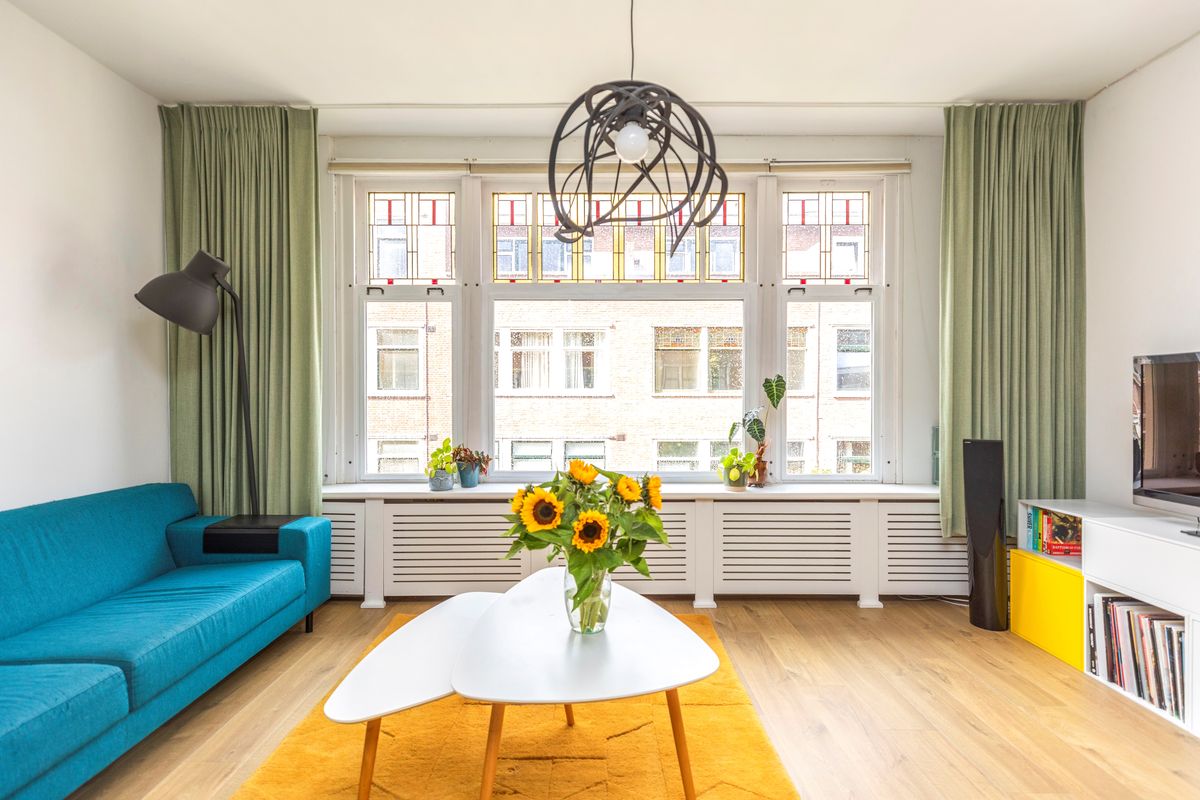 De ruime L-vormige woonkamer bevindt zich aan de voorzijde van het appartement. Dankzij de grote raampartijen geniet u hier de hele dag van een overvloed aan natuurlijk licht. Boven de ramen zorgen prachtige glas-in-lood details voor extra charme. De radiatoren zijn keurig weggewerkt, terwijl witte wanden en plafonds bijdragen aan een moderne en frisse uitstraling. Er is voldoende ruimte om een comfortabele zithoek te creëren én een gezellig eetgedeelte in te richten.