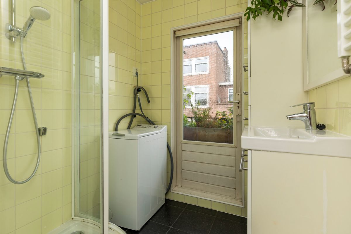 De badkamer is fris en speels vormgegeven met een combinatie van zwarte vloertegels en vrolijke lichtgroene wandtegels. De ruimte beschikt over een modern wastafelmeubel met mengkraan, een ruime douchehoek en aansluitingen voor de wasmachine. Ook vanuit de badkamer bereikt u het balkon.