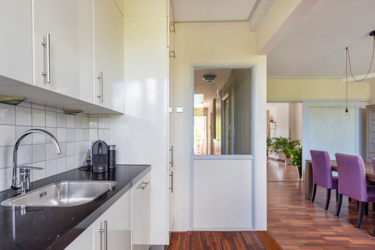 Via een brede schuifdeur is de eetkamer aan de achterzijde bereikbaar. Een groot pluspunt, want je kunt deze twee kamers volledig van elkaar scheiden voor extra privacy, of juist met elkaar verbinden tot één open geheel.