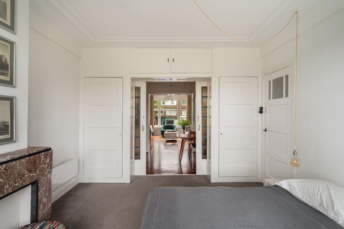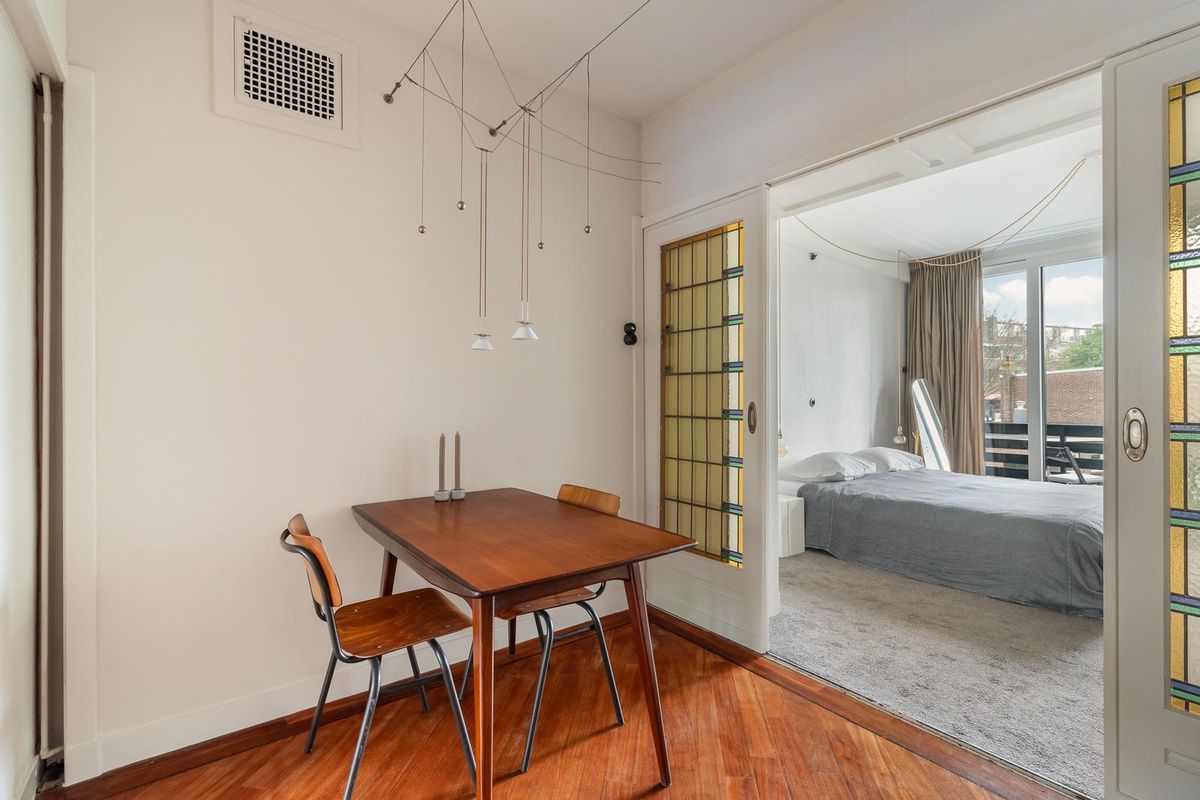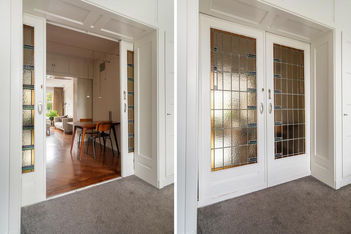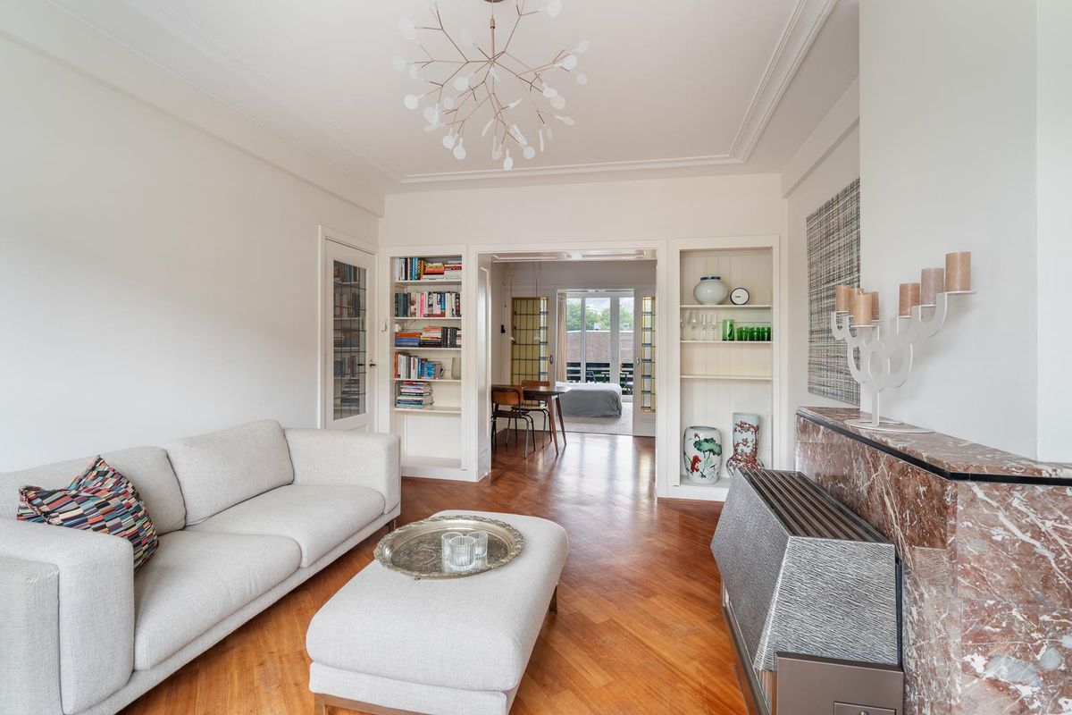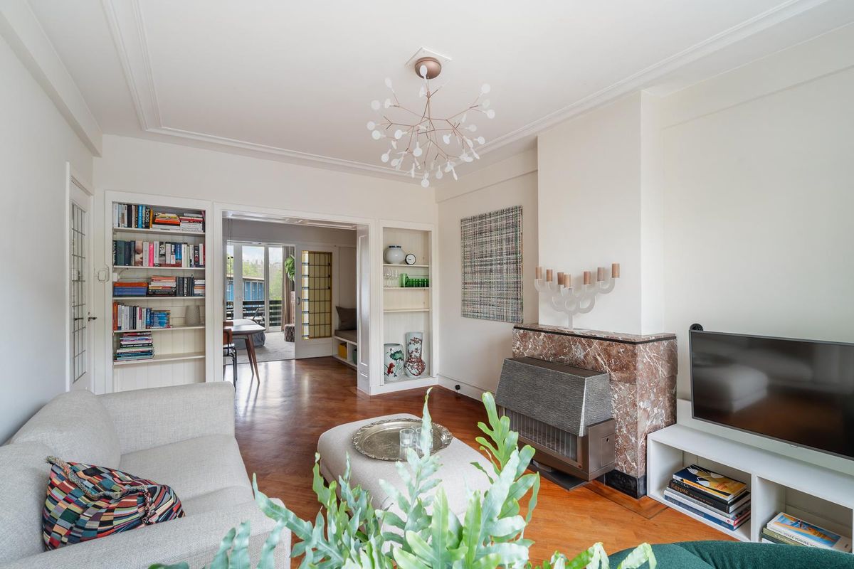 Ruime hal/entree met twee vaste kasten en toegang tot alle vertrekken. De ruime woonkamer met en suite inbouwkasten is gelegen aan de voorzijde van het appartement. Direct wordt je overspoeld met tal van prachtige originele jaren '30 details zoals o.a. de ornamenten, het glas-in-lood, paneeldeuren wat het een zeer authentieke sfeer geeft. Door de grote raampartijen aan beide zijde van de woning, treedt er veel natuurlijk licht de woning binnen, wat zorgt voor een aangename, lichte sfeer. Het eetgedeelte zit in het midden van de woning en er is voldoende ruimte voor een eettafel.