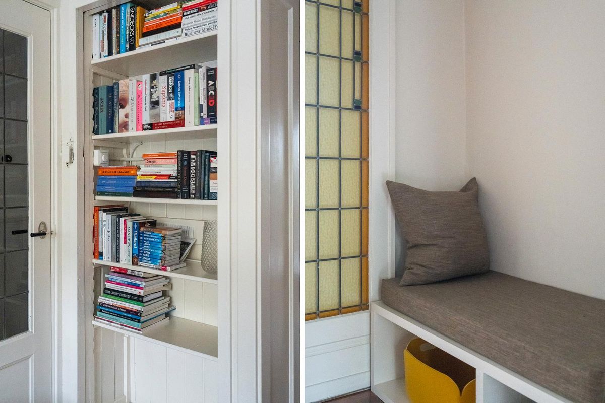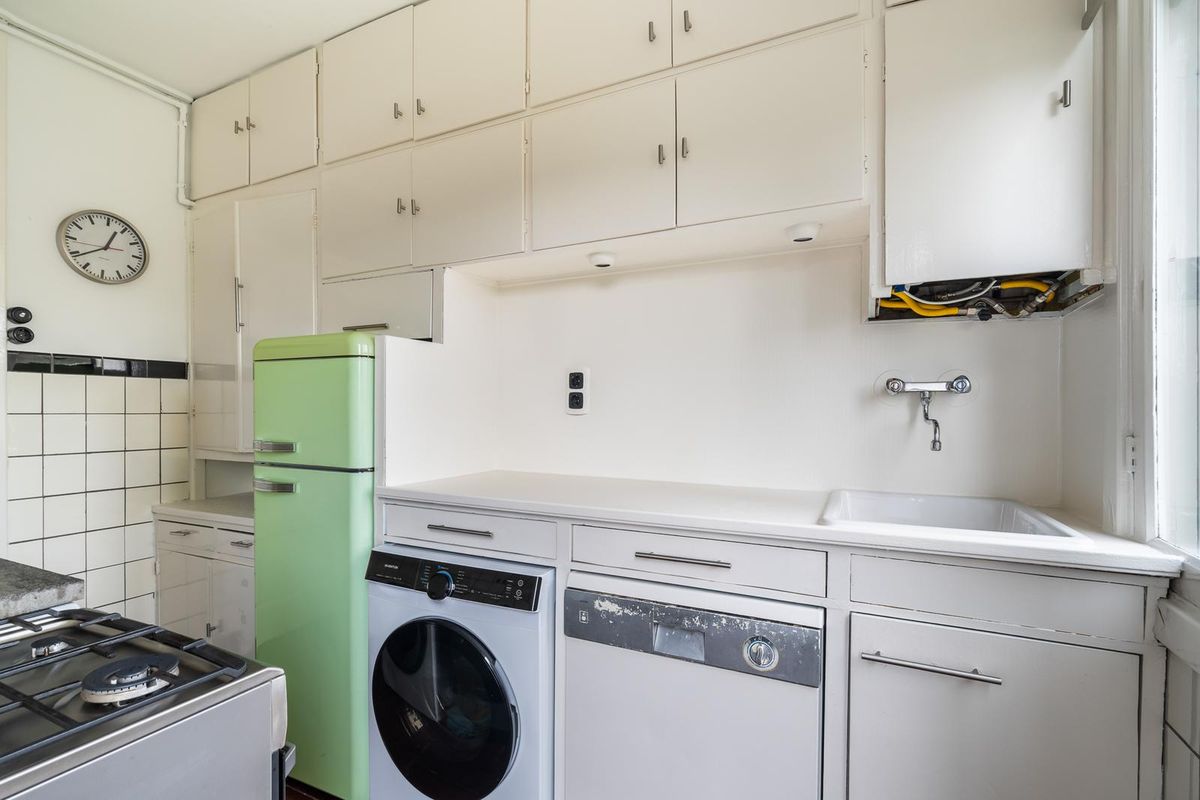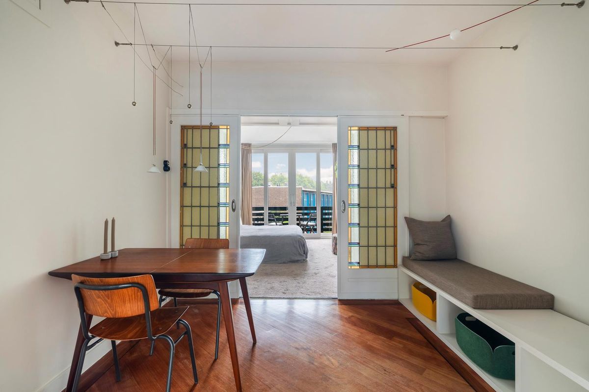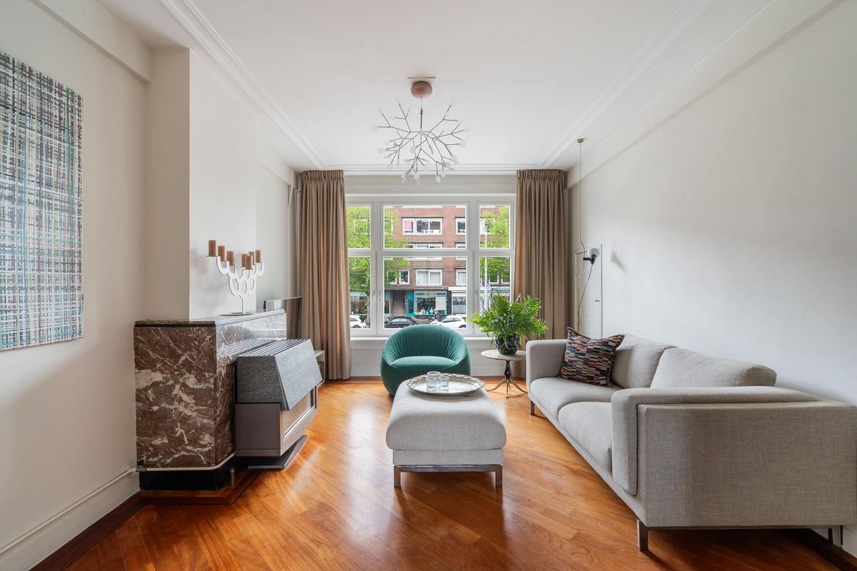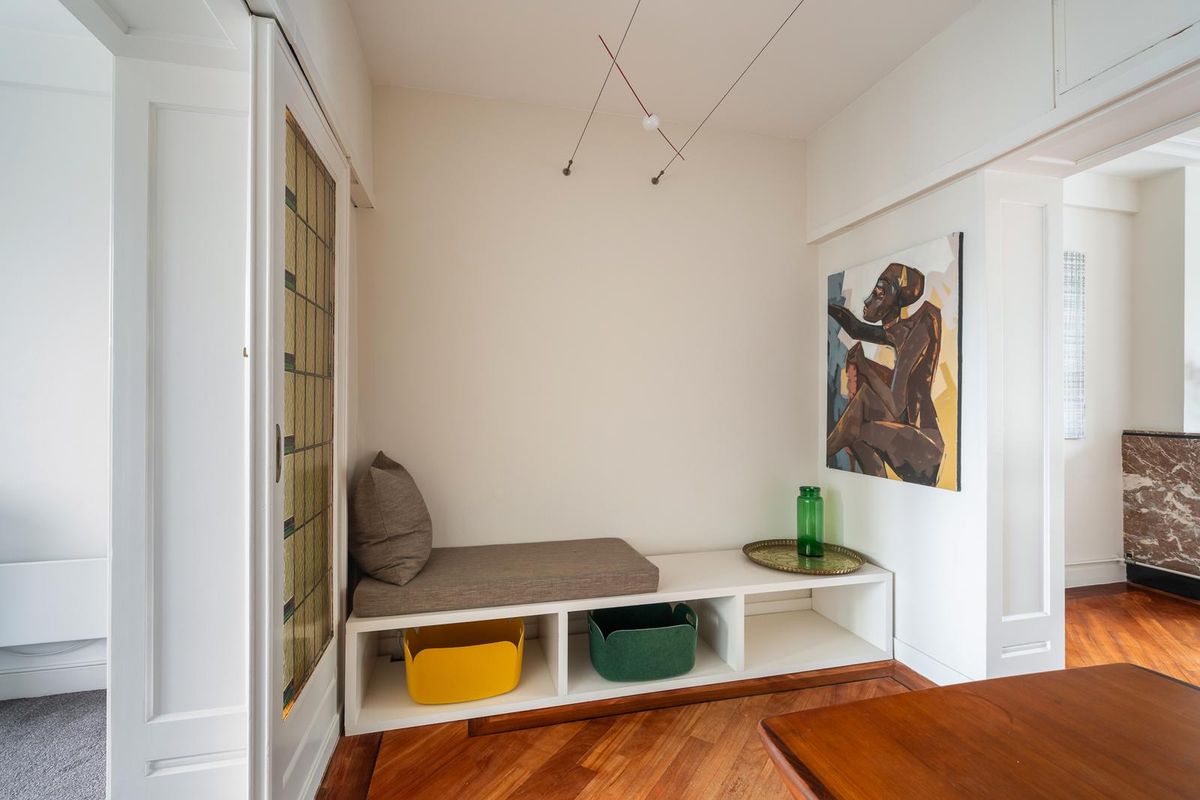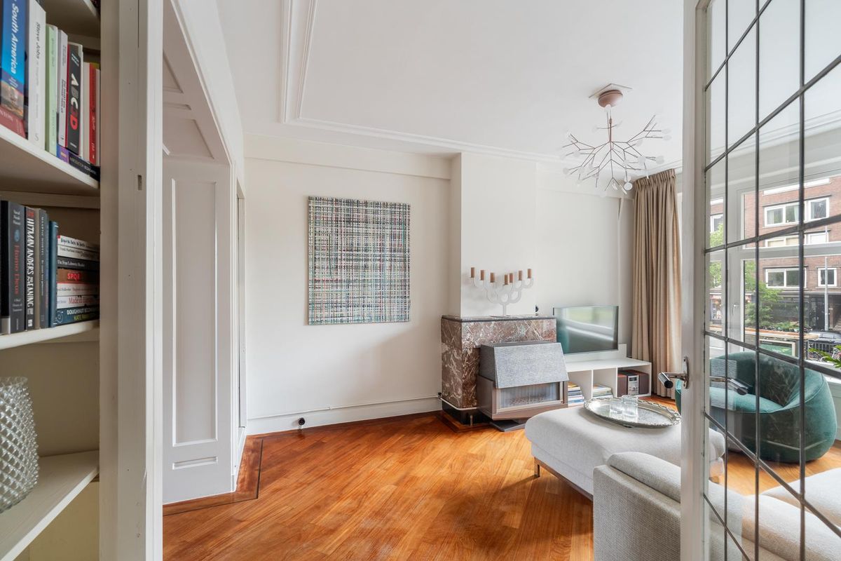 Ruime hal/entree met twee vaste kasten en toegang tot alle vertrekken. De ruime woonkamer met en suite inbouwkasten is gelegen aan de voorzijde van het appartement. Direct wordt je overspoeld met tal van prachtige originele jaren '30 details zoals o.a. de ornamenten, het glas-in-lood, paneeldeuren wat het een zeer authentieke sfeer geeft. Door de grote raampartijen aan beide zijde van de woning, treedt er veel natuurlijk licht de woning binnen, wat zorgt voor een aangename, lichte sfeer. Het eetgedeelte zit in het midden van de woning en er is voldoende ruimte voor een eettafel.