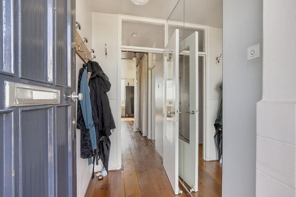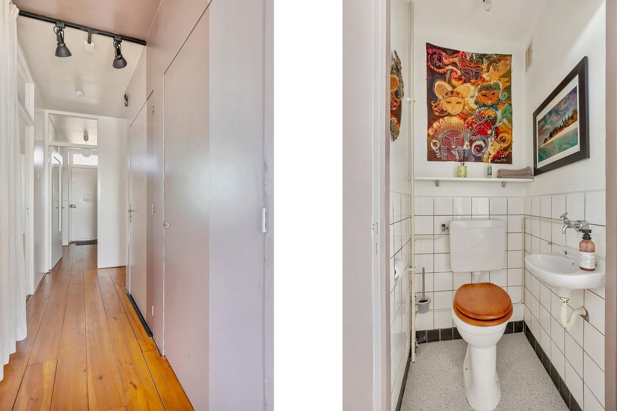 Je komt binnen in de hal, waar ruimte is voor een garderobe. Deze sluit aan op de gang, waar zich ook het toilet bevindt, en biedt toegang tot de verschillende vertrekken van het appartement. De woonkamer oogt licht en ruim dankzij de grote raampartijen. Een tussenwand creëert een duidelijke scheiding tussen het zitgedeelte en de eethoek, waardoor er een gezellige en praktische indeling ontstaat.