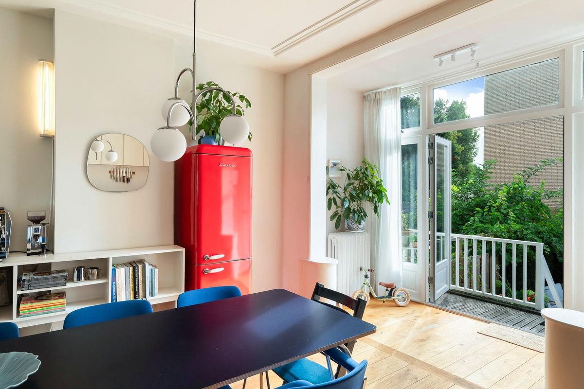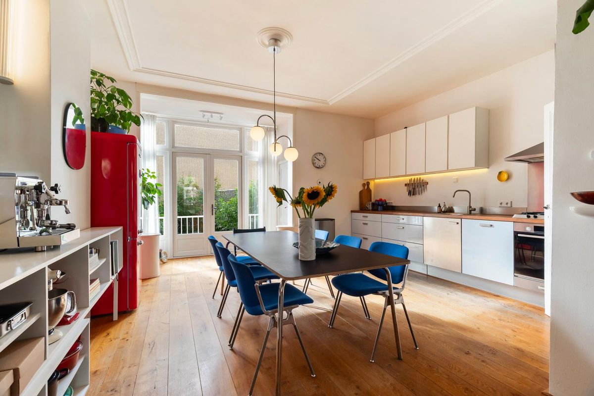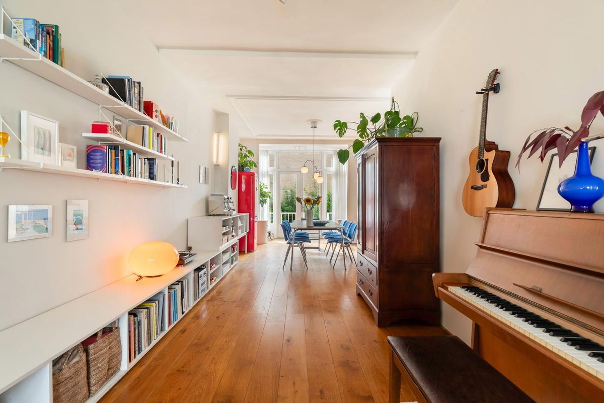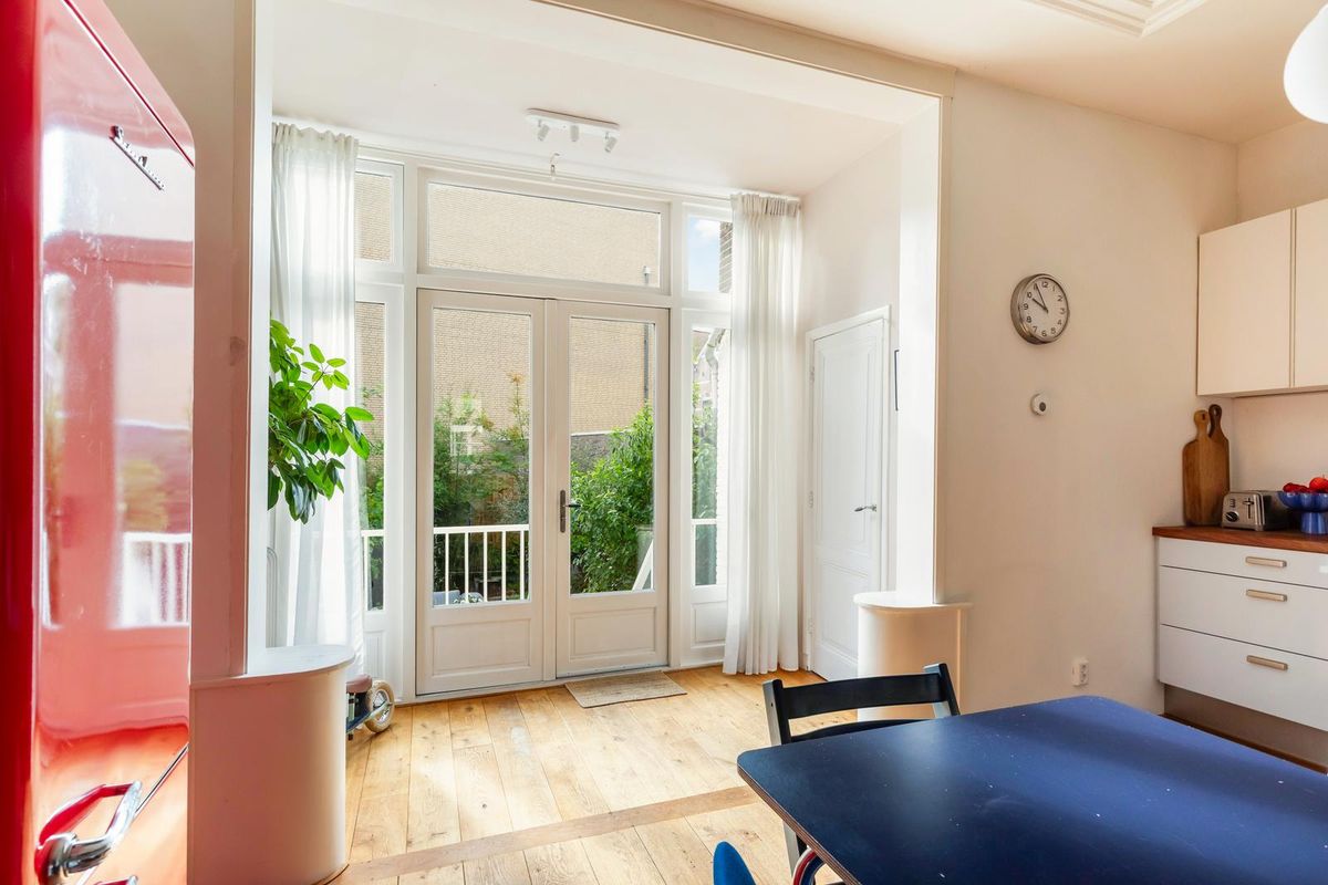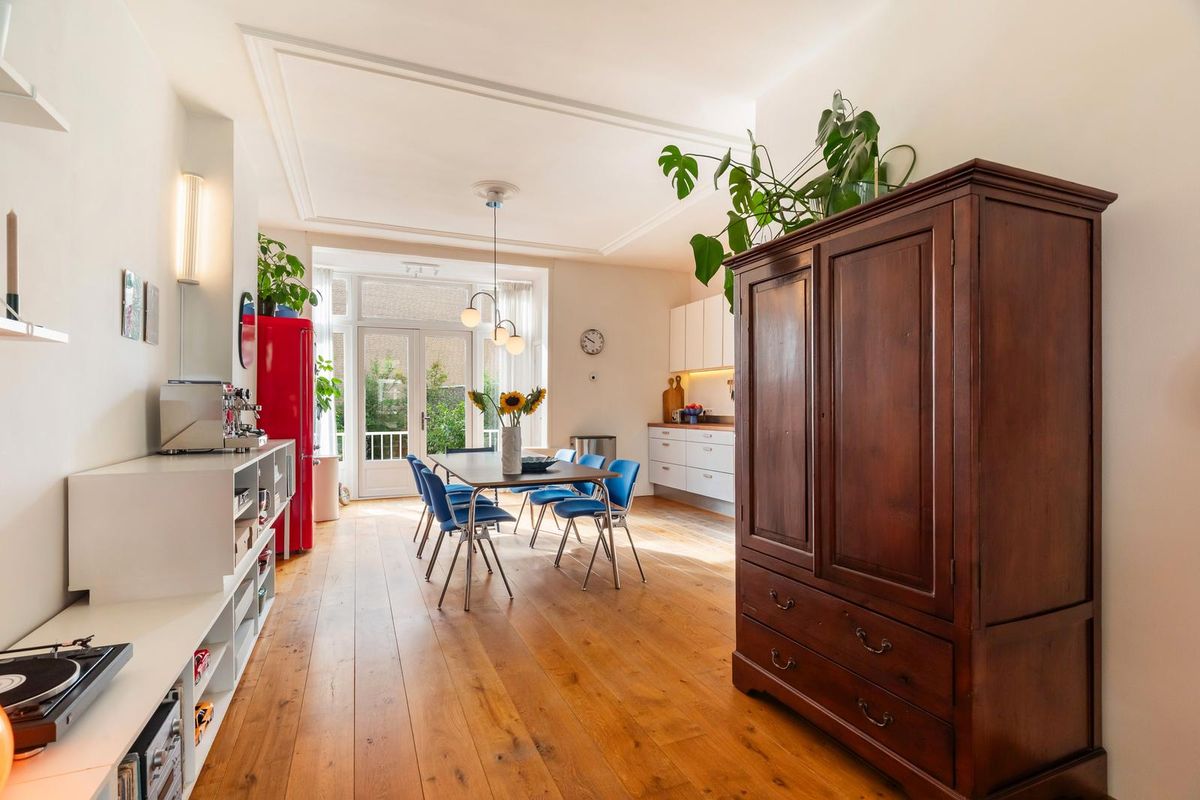 Hal/entree met tochtportaal, toilet, kast en toegang tot de woonkamer. Het woongedeelte is gelegen aan de voorzijde van woning. Door de grote raampartijen treedt er een mooie en natuurlijke lichtinval de woning binnen. Met een lengte van ruim 12 meter lang en een plafondhoogte van bijna 3 meter hoog voelt de kamer ontzettend ruimtelijk aan en is er voldoende plek voor een riante zit-en eethoek. Ook de originele details zoals de schouwen en de plafondlijsten geven de ruimte veel sfeer en karakter. De open keuken staat in directe verbinding met het eetgedeelte, waardoor je tijdens het koken in contact kunt blijven met je gezelschap. De keuken beschikt over diverse inbouwapparatuur, zoals een 5-pits gasfornuis, afzuigkap, oven en vaatwasser. Vanuit de eetkamer bereik je de serre, waar je heerlijk overdekt kunt genieten van het prachtige uitzicht over de tuin. Ook vanuit hier bereik je de ruime berging (met extra wastafel), erg handig voor extra opbergruimte. Grenzend aan de serre is er een terras, met een kleine trap naar de lager gelegen tuin. De tuin is gelegen op het zuidoosten, waardoor je hier een groot gedeelte van de dag van de zon kunt genieten.