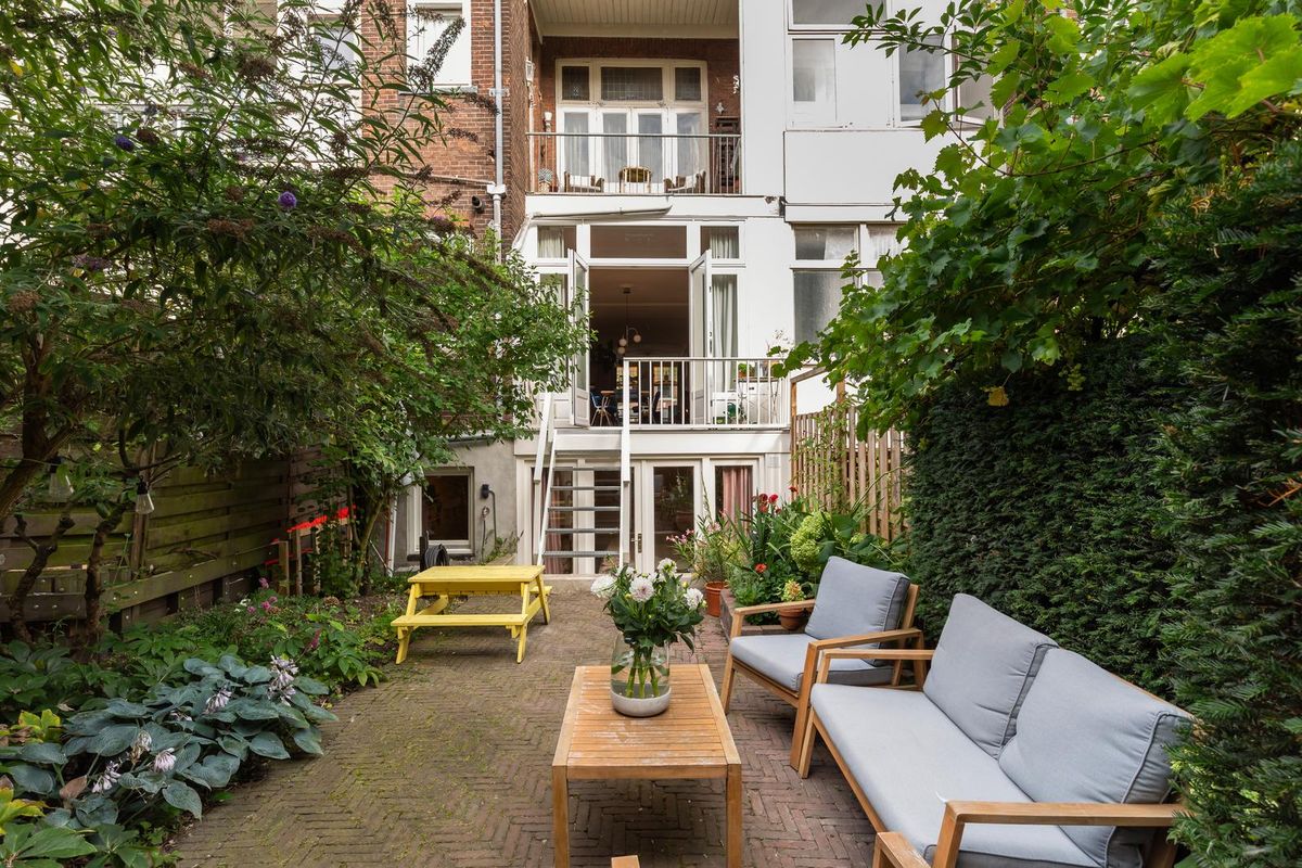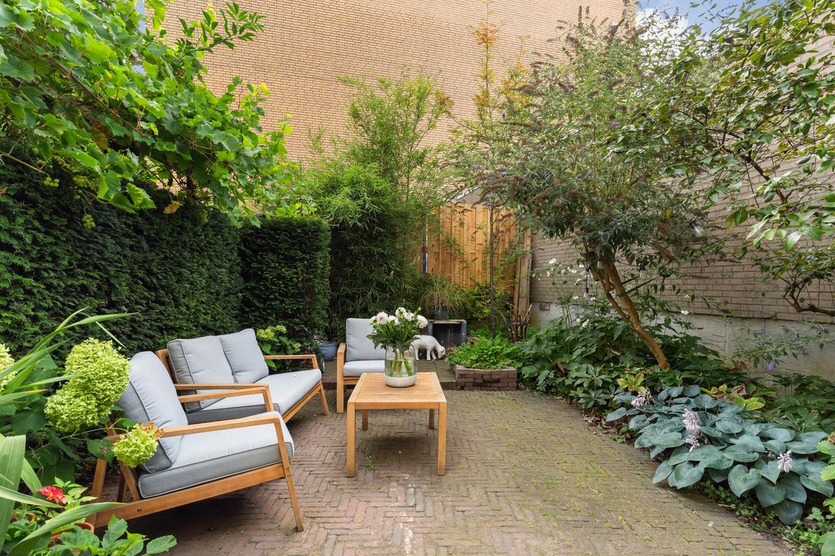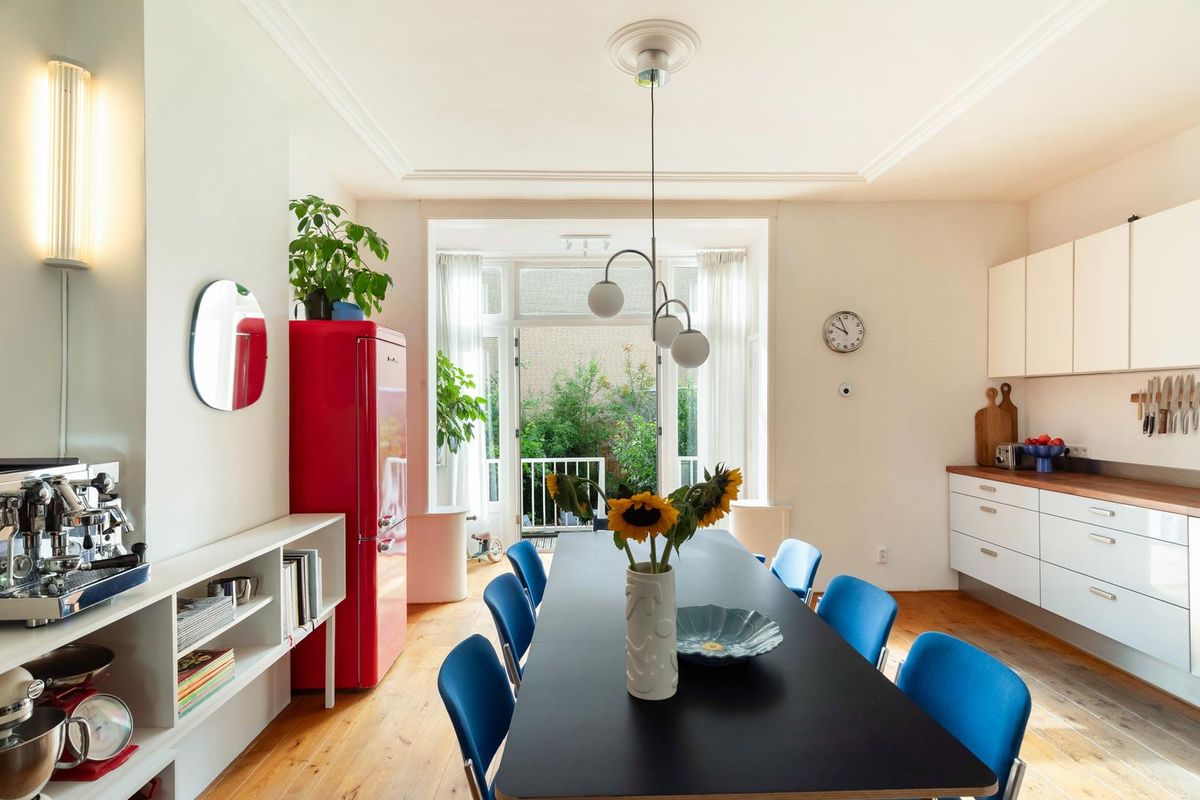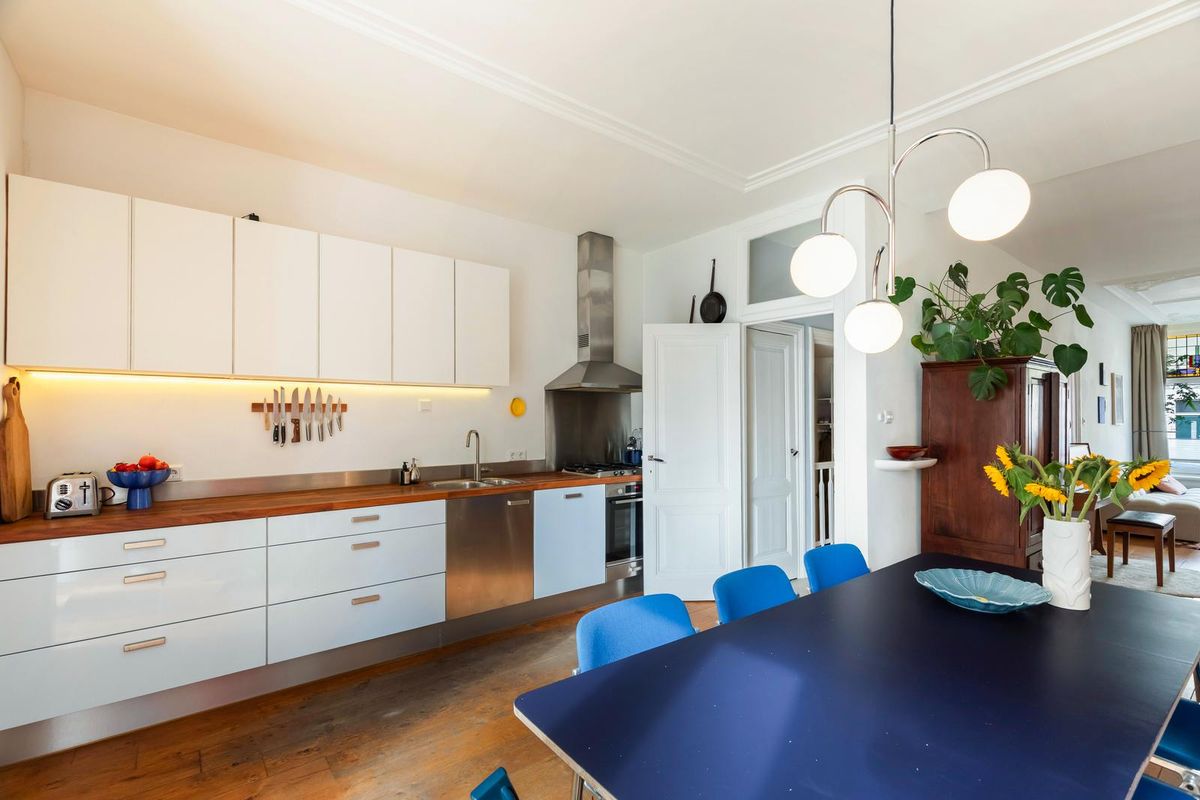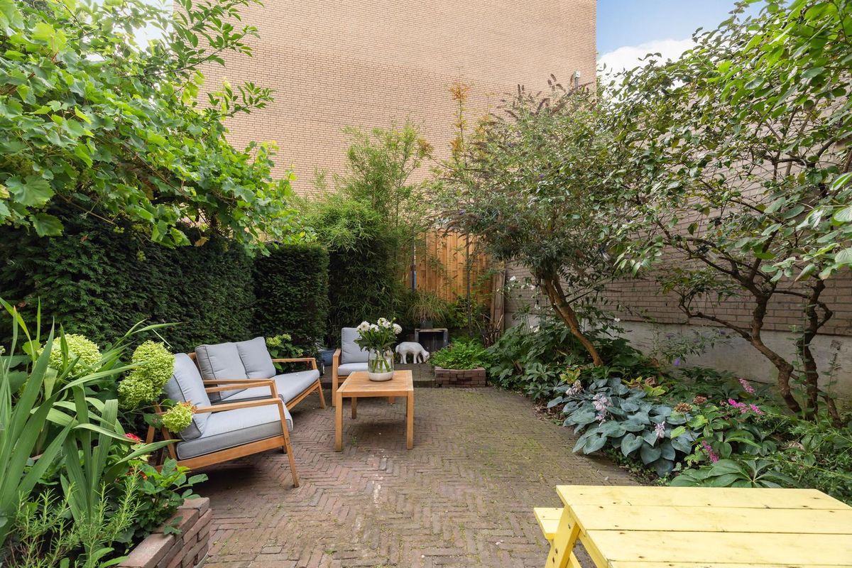Hal/entree met tochtportaal, toilet, kast en toegang tot de woonkamer. Het woongedeelte is gelegen aan de voorzijde van woning. Door de grote raampartijen treedt er een mooie en natuurlijke lichtinval de woning binnen. Met een lengte van ruim 12 meter lang en een plafondhoogte van bijna 3 meter hoog voelt de kamer ontzettend ruimtelijk aan en is er voldoende plek voor een riante zit-en eethoek. Ook de originele details zoals de schouwen en de plafondlijsten geven de ruimte veel sfeer en karakter. De open keuken staat in directe verbinding met het eetgedeelte, waardoor je tijdens het koken in contact kunt blijven met je gezelschap. De keuken beschikt over diverse inbouwapparatuur, zoals een 5-pits gasfornuis, afzuigkap, oven en vaatwasser. Vanuit de eetkamer bereik je de serre, waar je heerlijk overdekt kunt genieten van het prachtige uitzicht over de tuin. Ook vanuit hier bereik je de ruime berging (met extra wastafel), erg handig voor extra opbergruimte. Grenzend aan de serre is er een terras, met een kleine trap naar de lager gelegen tuin. De tuin is gelegen op het zuidoosten, waardoor je hier een groot gedeelte van de dag van de zon kunt genieten.