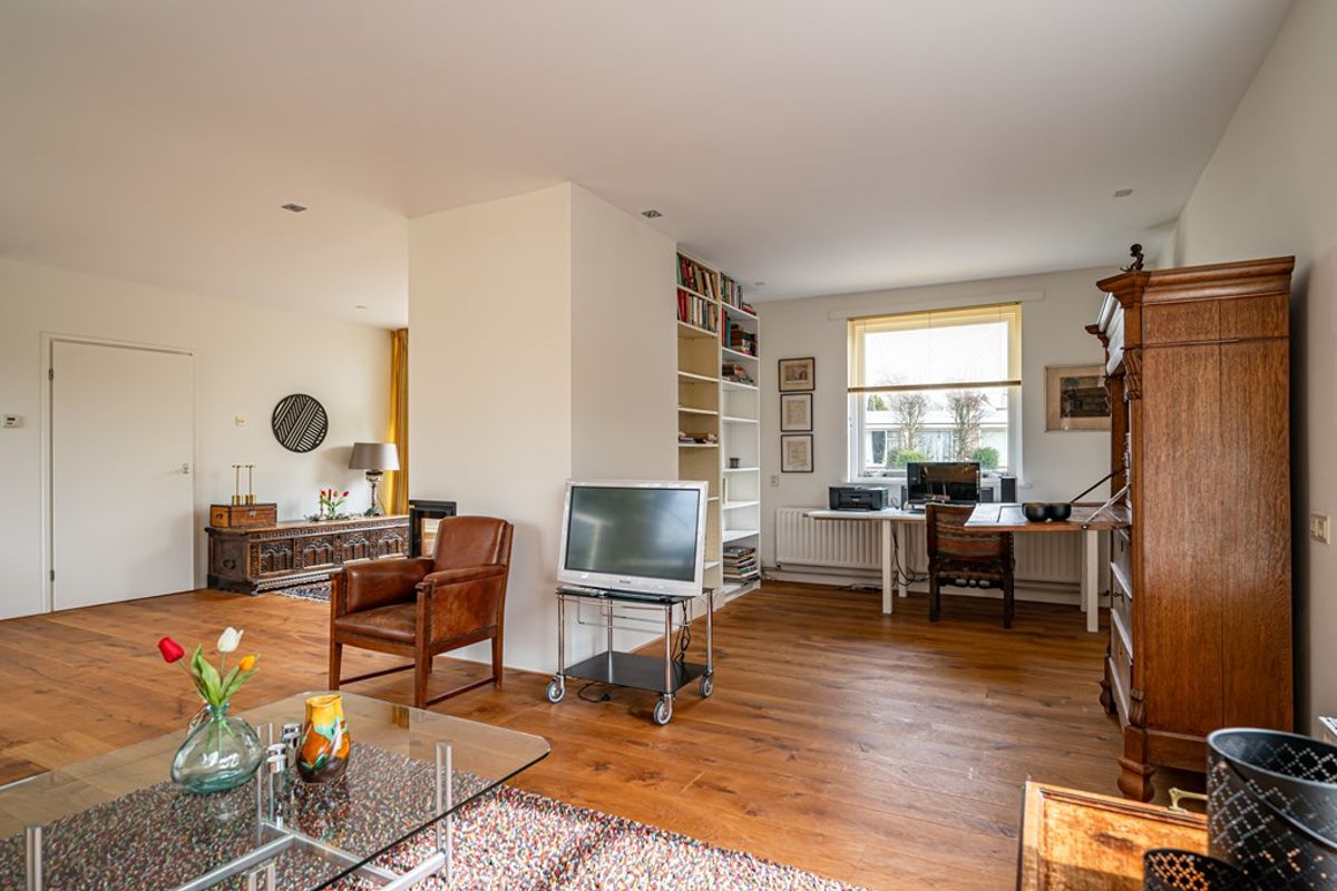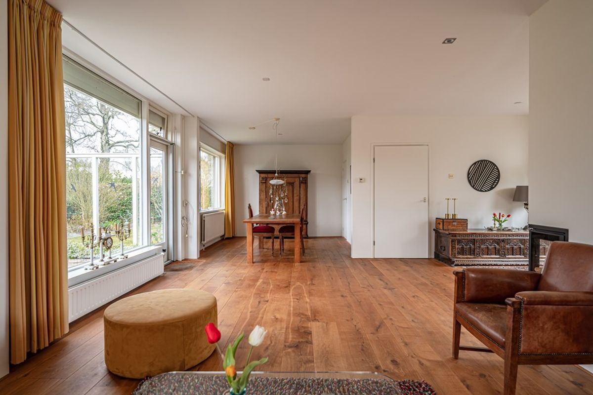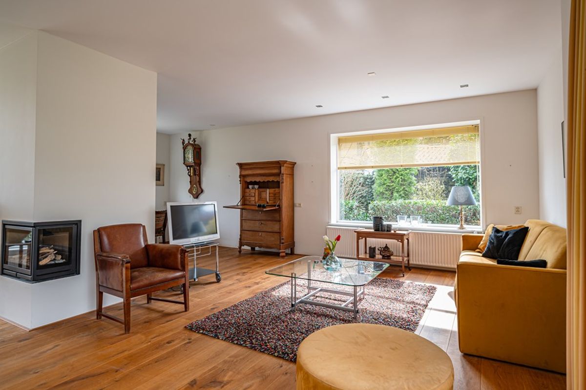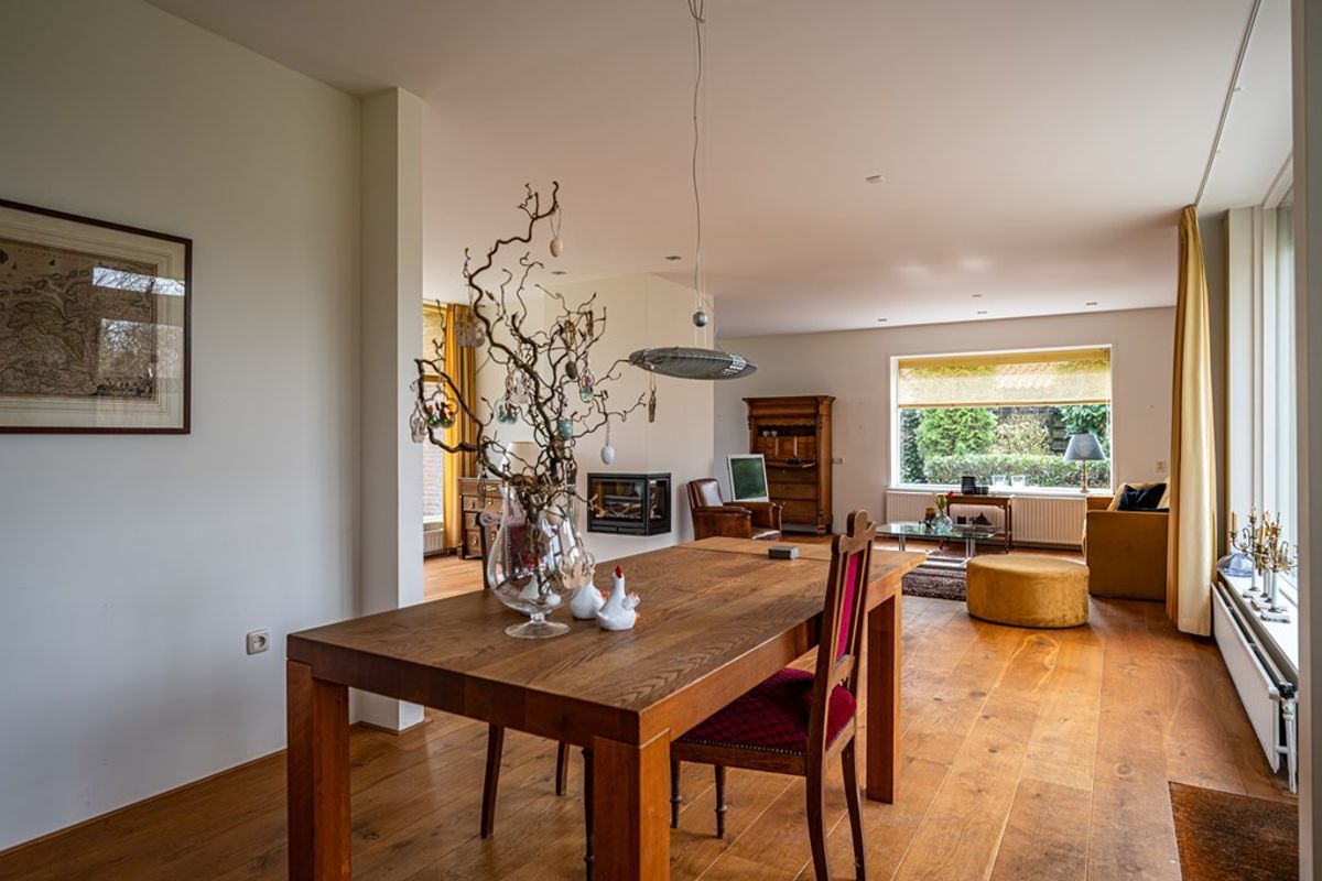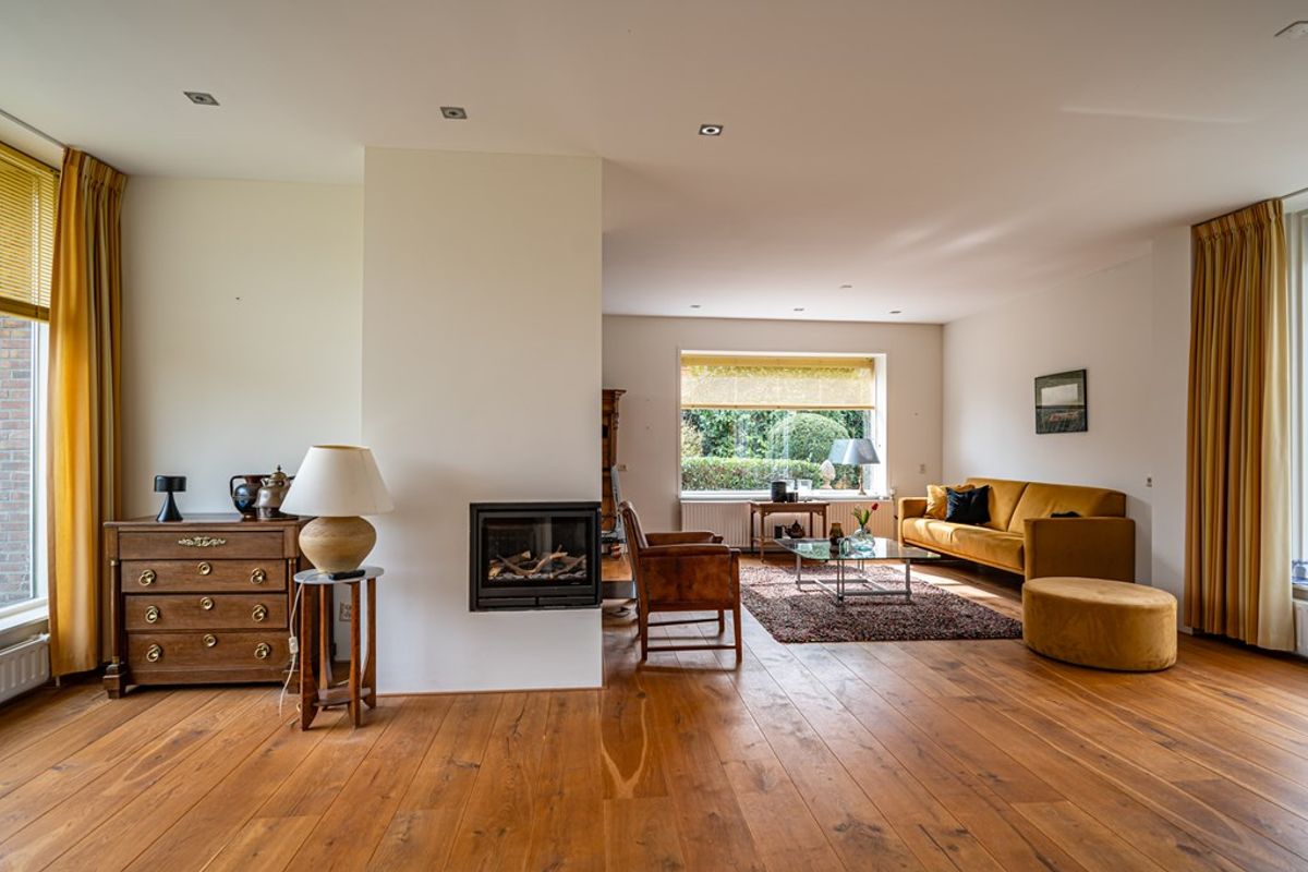 • Royale woonkamer met eetgedeelte, gelegen aan zowel de straat- als tuinzijde. De woonkamer is voorzien van een sfeervolle gashaard met strakke schouw, een massief eikenhouten vloer en een deur naar het terras. Grote raampartijen zorgen voor veel lichtinval en een fraai uitzicht op de tuin.