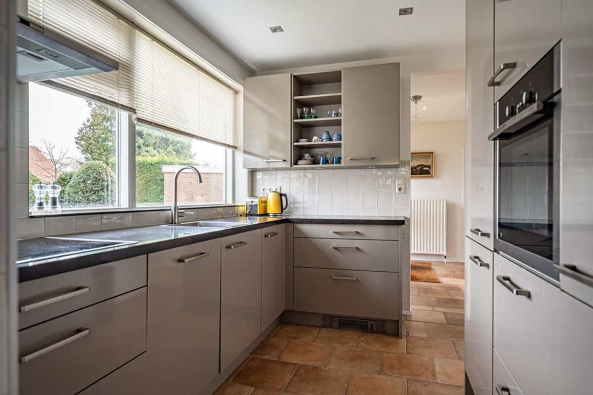 • Gesloten keuken in praktische hoekopstelling met separate kastenwand. De keuken is uitgerust met moderne inbouwapparatuur, waaronder een oven, vaatwasser, inductiekookplaat, afzuigkap en koelkast. Het natuurstenen werkblad geeft het geheel een luxe uitstraling.