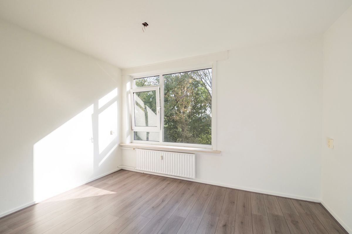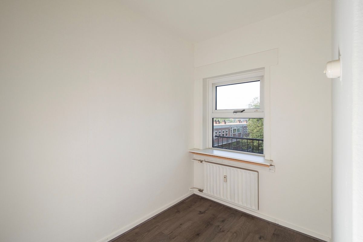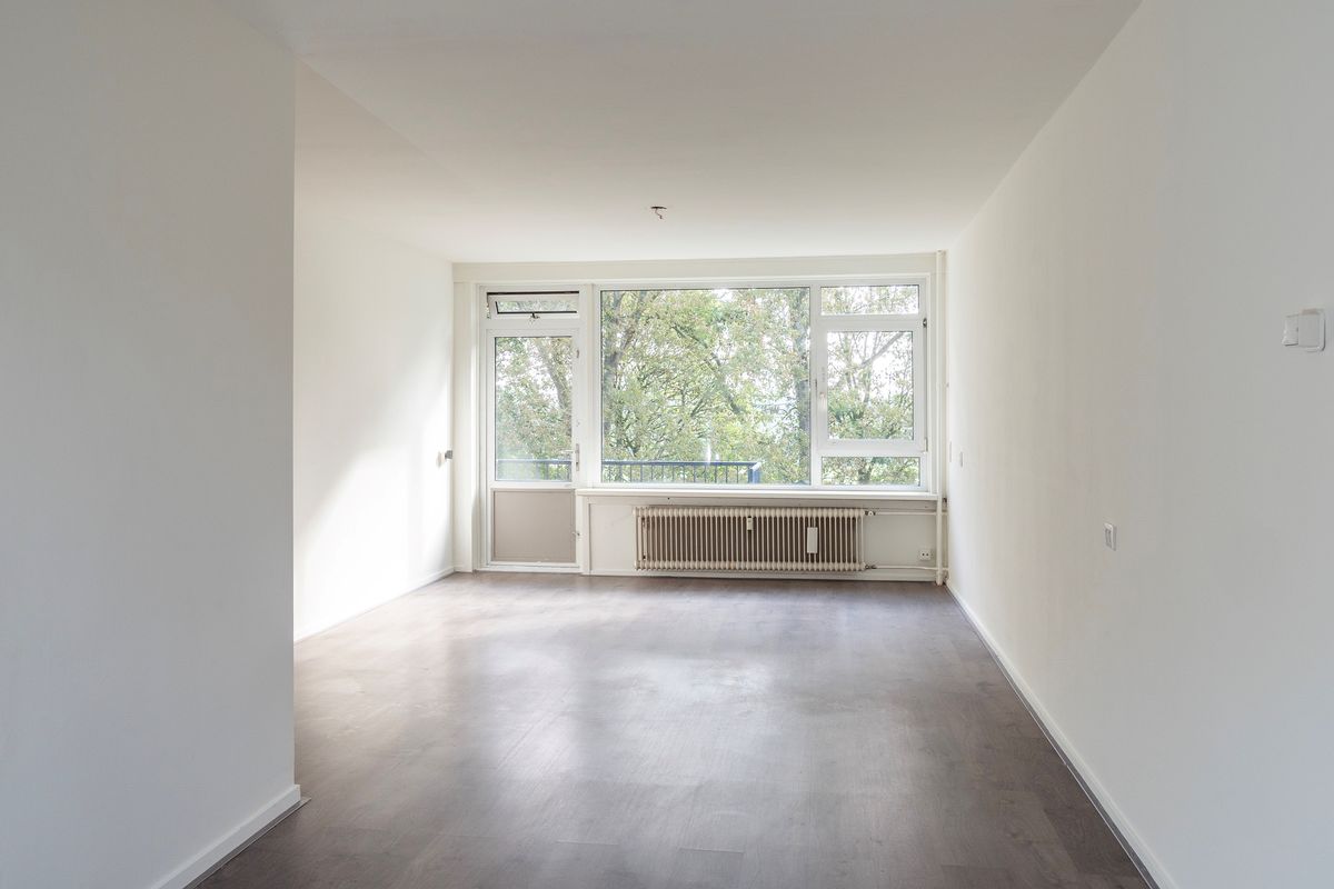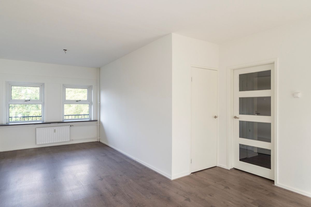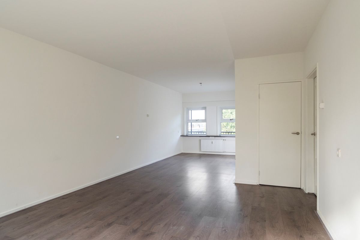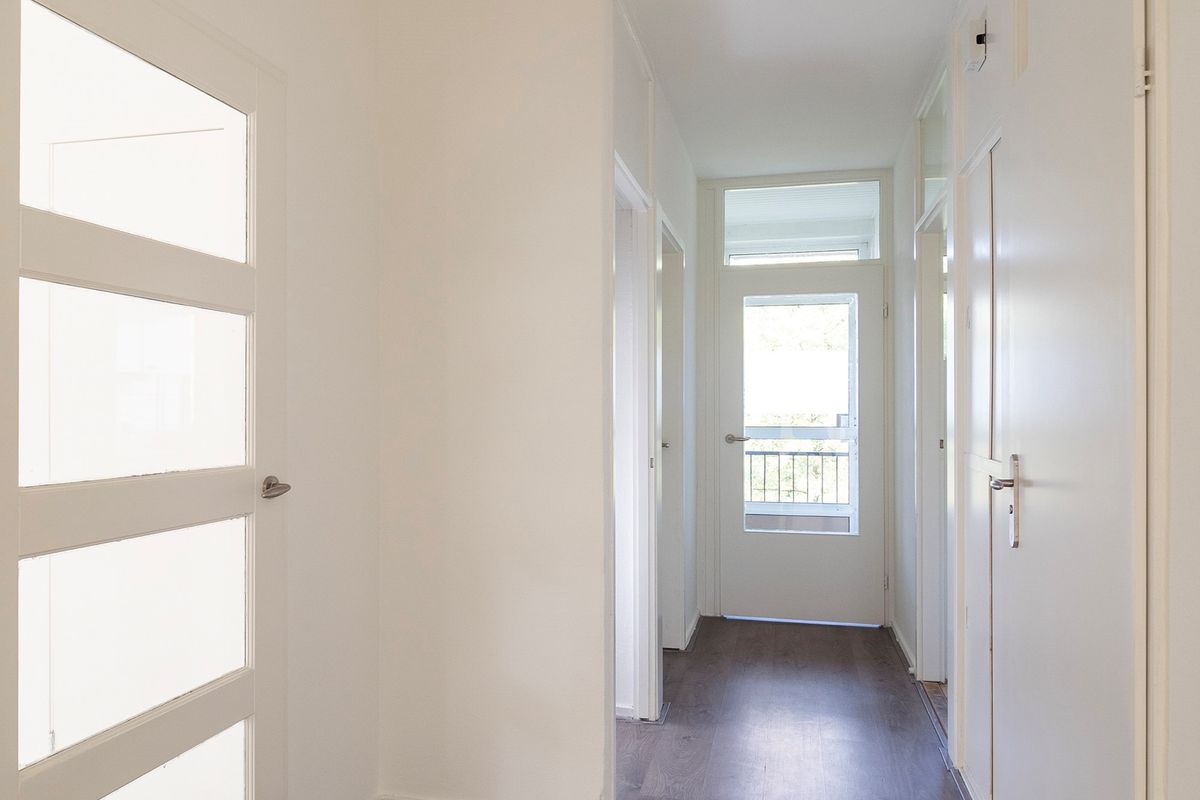 Woonverdieping: Via een entree biedt de hal toegang tot alle vertrekken, te weten de woonkamer, de keuken, twee slaapkamers, een nieuwe toiletruimte en een nieuwe badkamer. De ruime woonkamer over de gehele diepte van het appartement beschikt over grote raampartijen in de voor- en achtergevel (oosten en westen). Verder heeft de woonkamer een balkon op het oosten met ruimte voor een zitje. De nette keuken is voorzien van inbouwapparatuur. Ook de twee slaapkamers, allebei met een ruime inbouwkast, zijn netjes afgewerkt. De badkamer en toilet zijn recent vernieuwd en strak betegeld, met een inloopdouche en wastafelmeubel. De woonkamer, hal en slaapkamers zijn voorzien van een grijze laminaatvloer met houtlook.