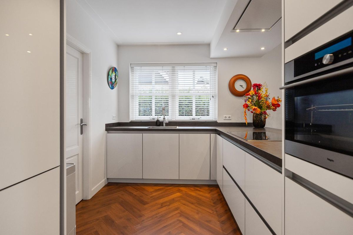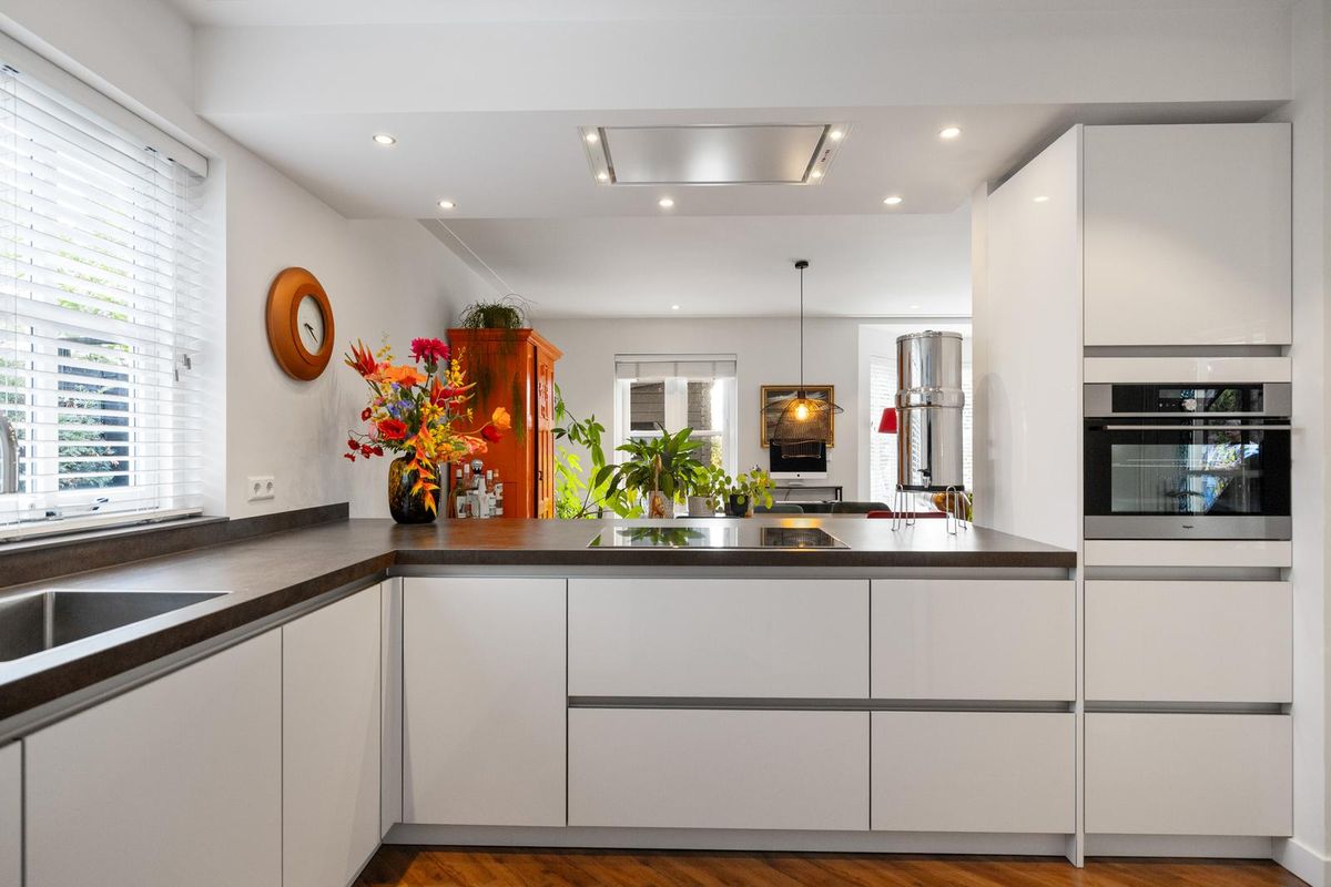 Entree, hal, meterkast, trapopgang naar de eerste verdieping. Ruime en lichte woonkamer met vloerverwarming, vier dubbele tuindeuren (en screens), voldoende zitmogelijkheden en een sfeervolle gashaard met schouw. Halfopen keuken met inbouwapparatuur zoals een vaatwasser uit 2025, inductiekookplaat, aanrechtblad van keramiek, Quooker, afzuigkap, oven en koel-vries combinatie. Vanuit de keuken loopt u naar de bijkeuken met vaste kast en witgoedopstelling. Vanuit de bijkeuken heeft u toegang tot de ruime garage met de cv ketel (2013) en warmtepomp installatie. Vanuit de garage heeft u ook toegang tot de oprit en de zijtuin.