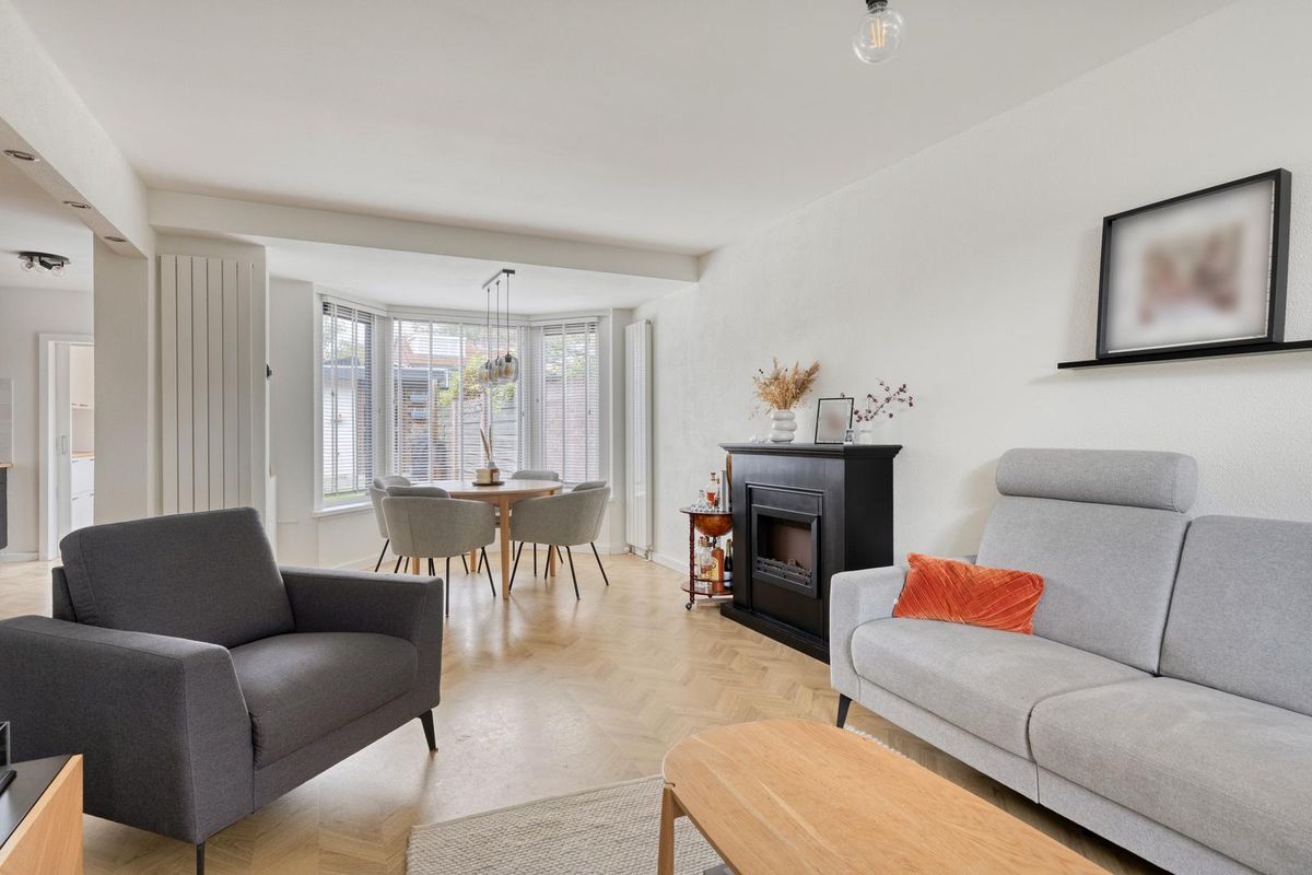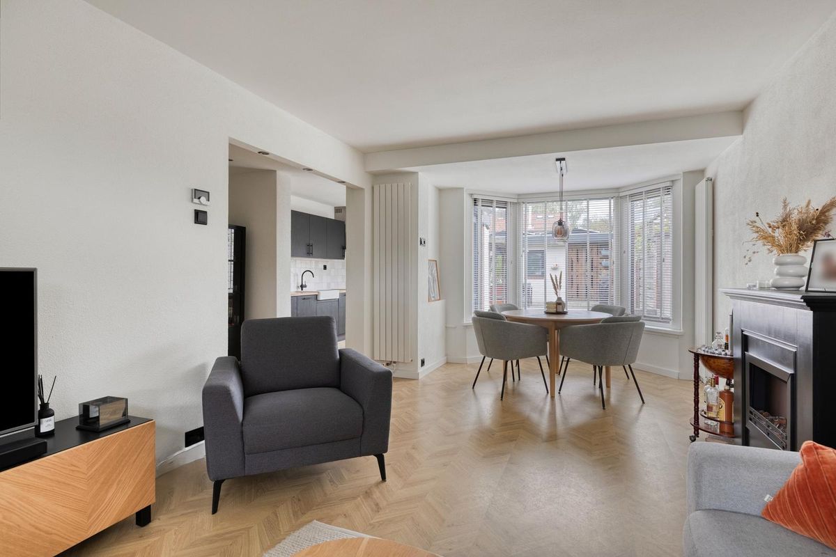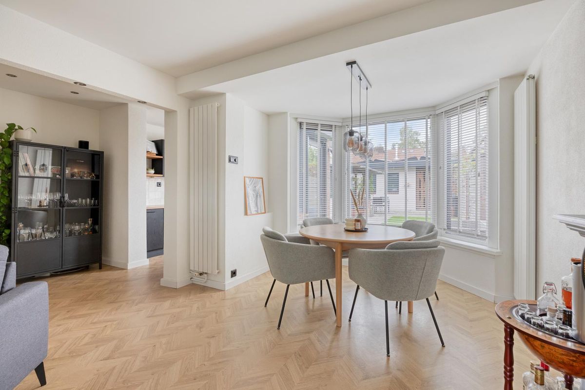 De sfeervolle woonkamer biedt een mooie vloer in visgraatmotief, een charmante erker aan de achterzijde en veel lichtinval. De kamer heeft een speelse indeling en biedt voldoende ruimte voor een ruime zithoek en een eetgedeelte.