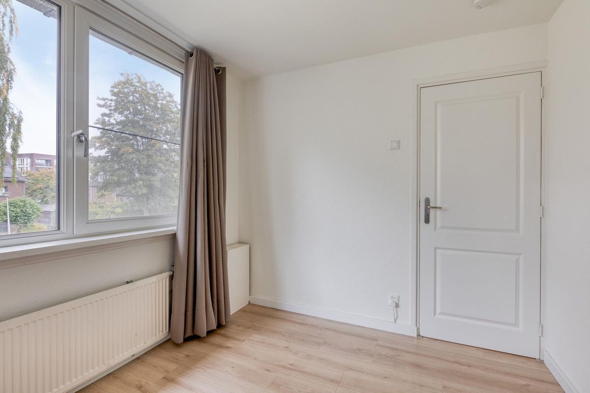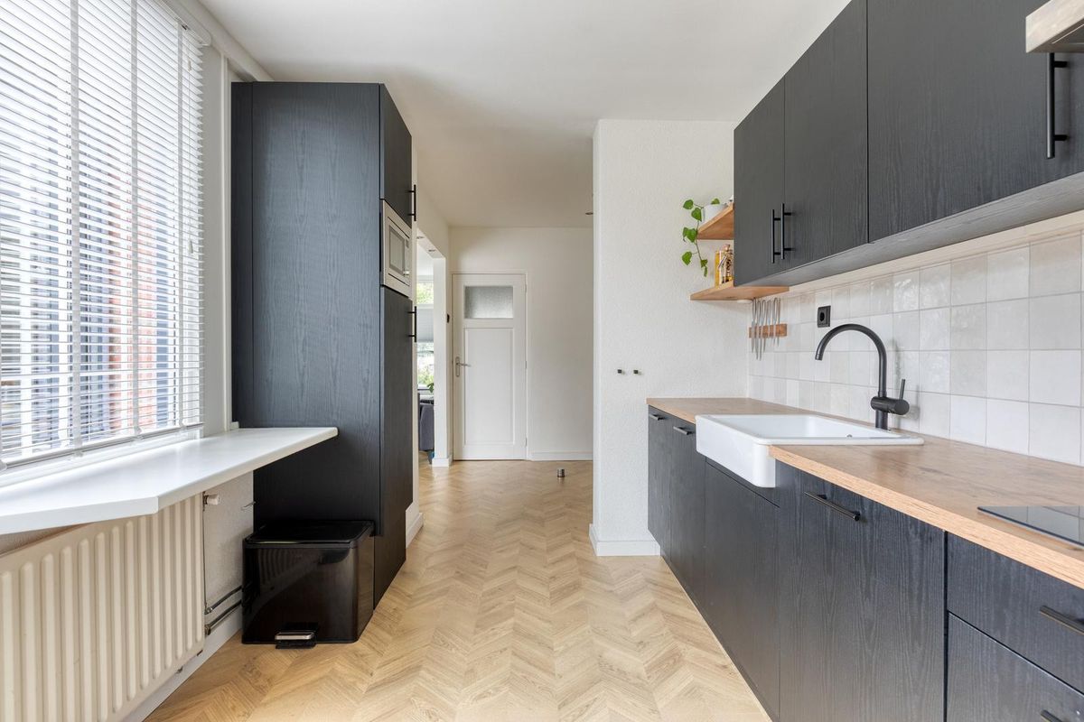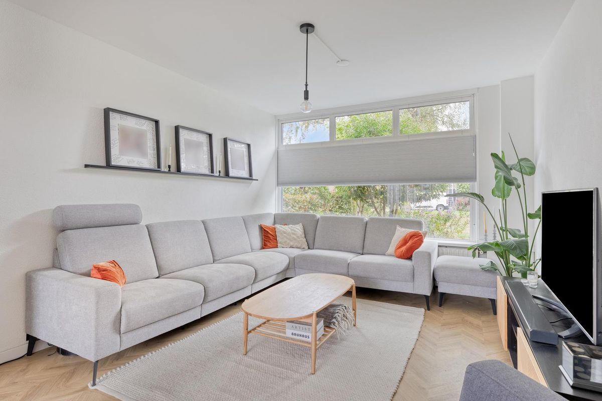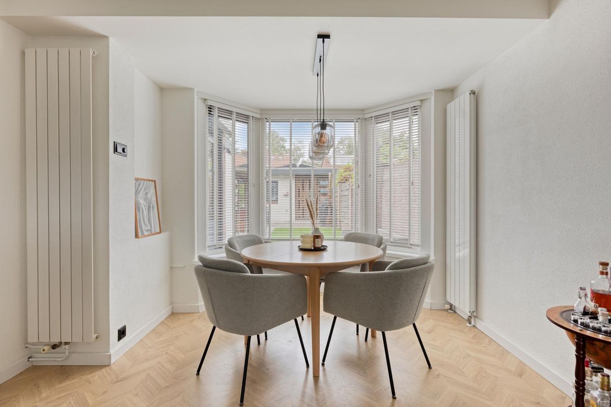 De sfeervolle woonkamer biedt een mooie vloer in visgraatmotief, een charmante erker aan de achterzijde en veel lichtinval. De kamer heeft een speelse indeling en biedt voldoende ruimte voor een ruime zithoek en een eetgedeelte.